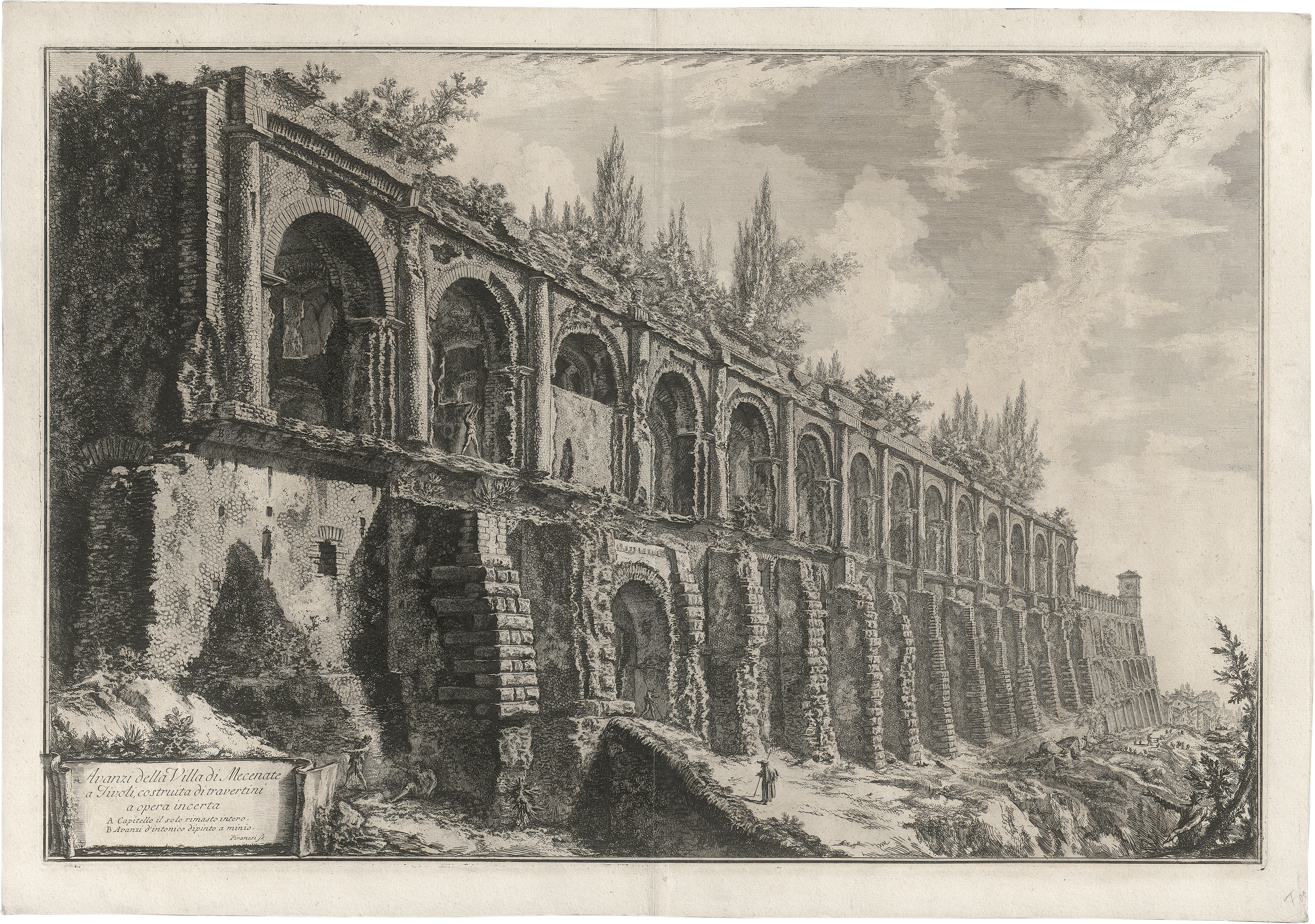 Avanzi della Villa di Mecenate a Tivoli, costruita di travertini a opera incerta. Radierung. 45,5 x 68 cm. (1763). Hind 65 I (von III). Wz. Lilie im Doppelkreis mit angehängten Buchstaben.