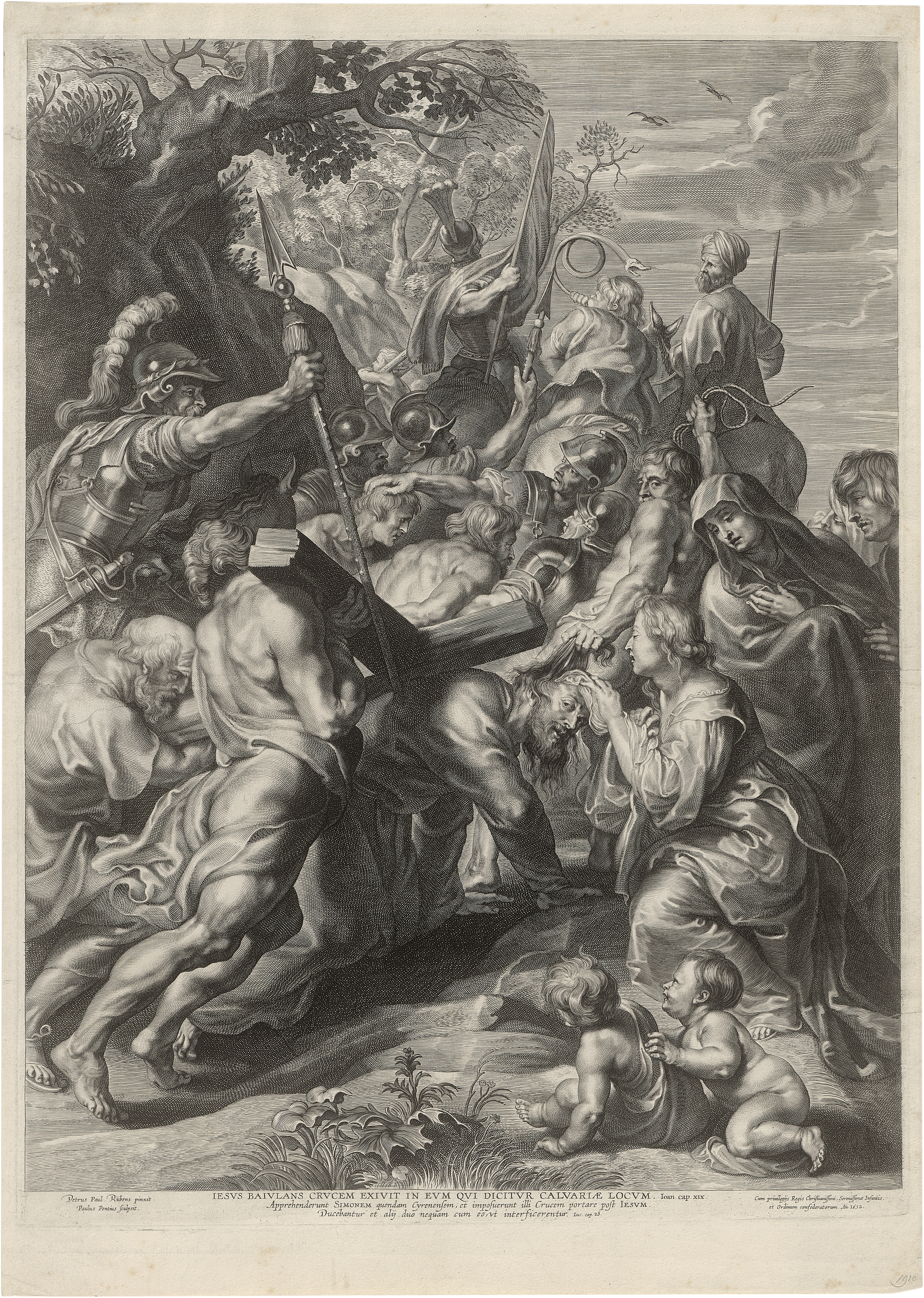 Die Kreuztragung. Kupferstich nach Rubens. 61,2 x 45,9 cm. 1632. Hollstein 8 II. Wz. Traube.