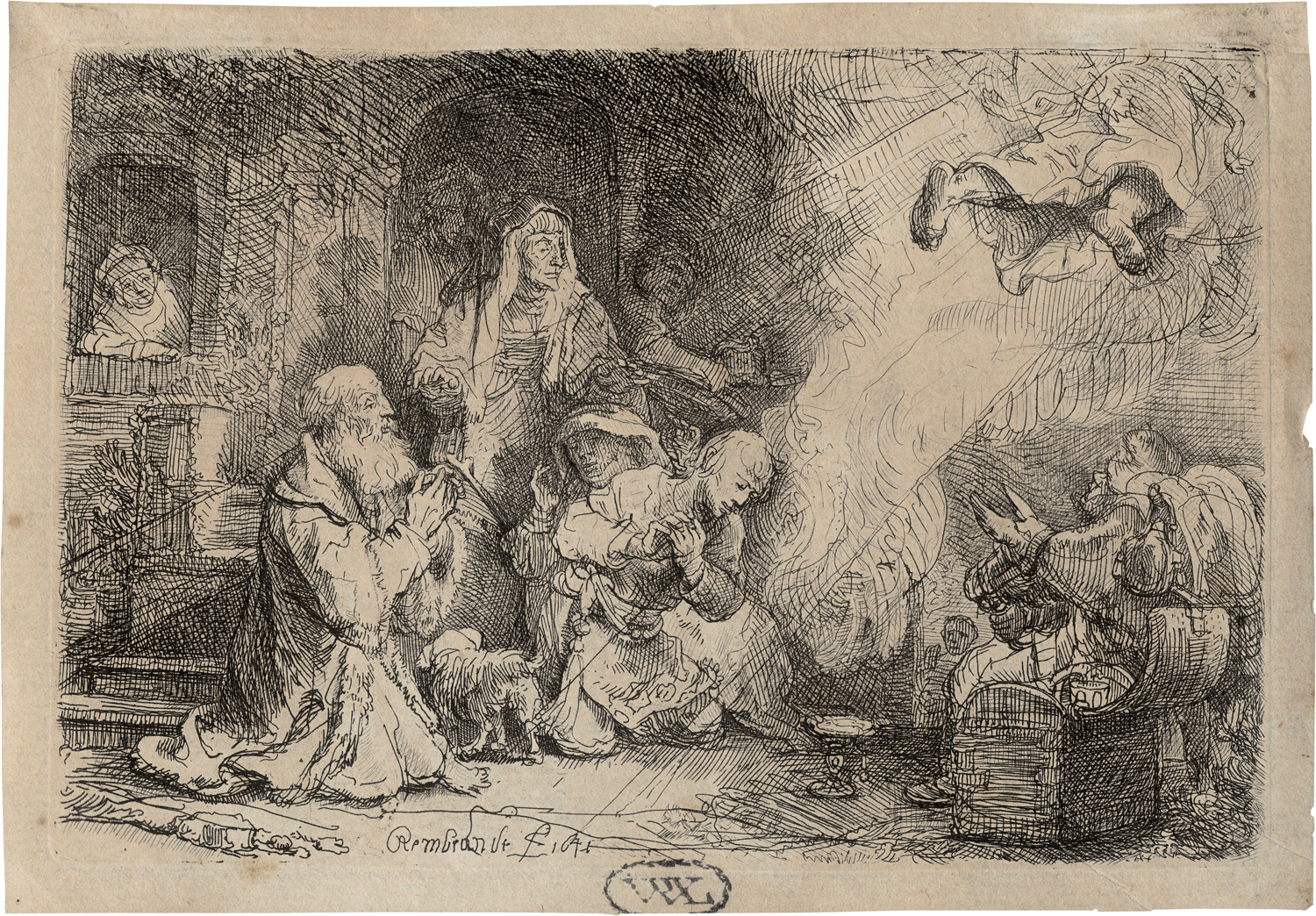 Der Engel vor der Familie des Tobias verschwindend. Radierung. 10,4 x 15,5 cm. 1641. B. 43, White/Boon (Hollstein) 43 III (von IV), Nowell-Usticke 43 VI (von VII), Hinterding/Rutgers (New Hollstein) 189 VIII (von IX).