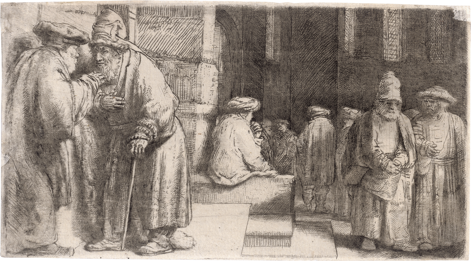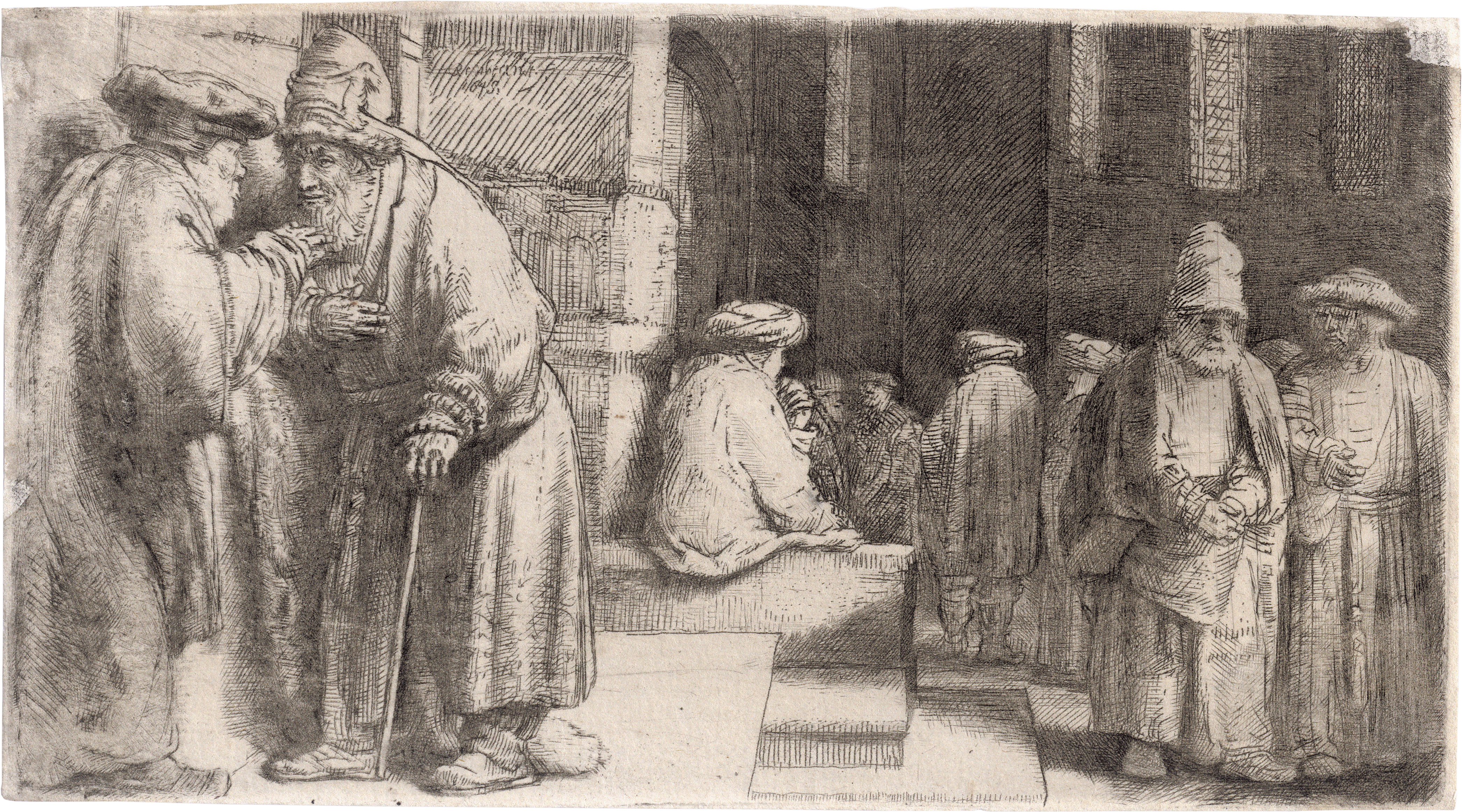 Juden in der Synagoge. Radierung. 7,1 x 13 cm. 1649. B. 126, White/Boon (Hollstein) 126 II (von III), Nowell-Usticke 126 II (von VII), Hinterding/Rutgers (New Hollstein) 242 IV (von VII).