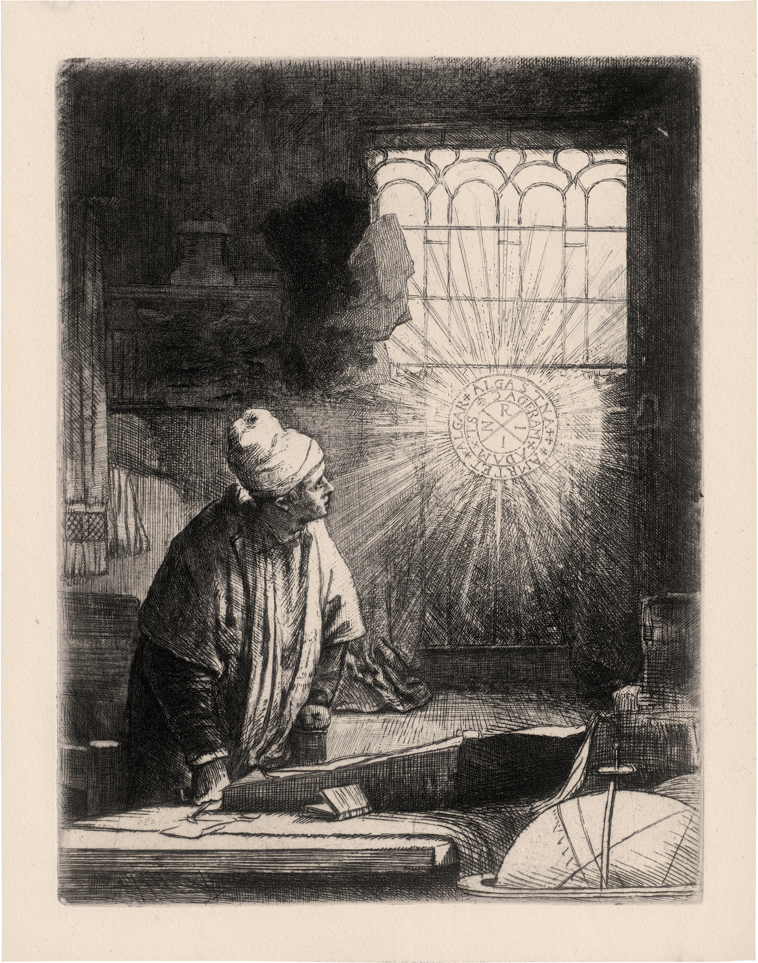 Gelehrter in seiner Stube, genannt: Faust. Radierung. 21,1 x 16,1 cm. Um 1652. B. 270, White/Boon (Hollstein) 270, Nowell-Usticke 270 VII, Hinterding/Rutgers (New Hollstein) 270 VIII.