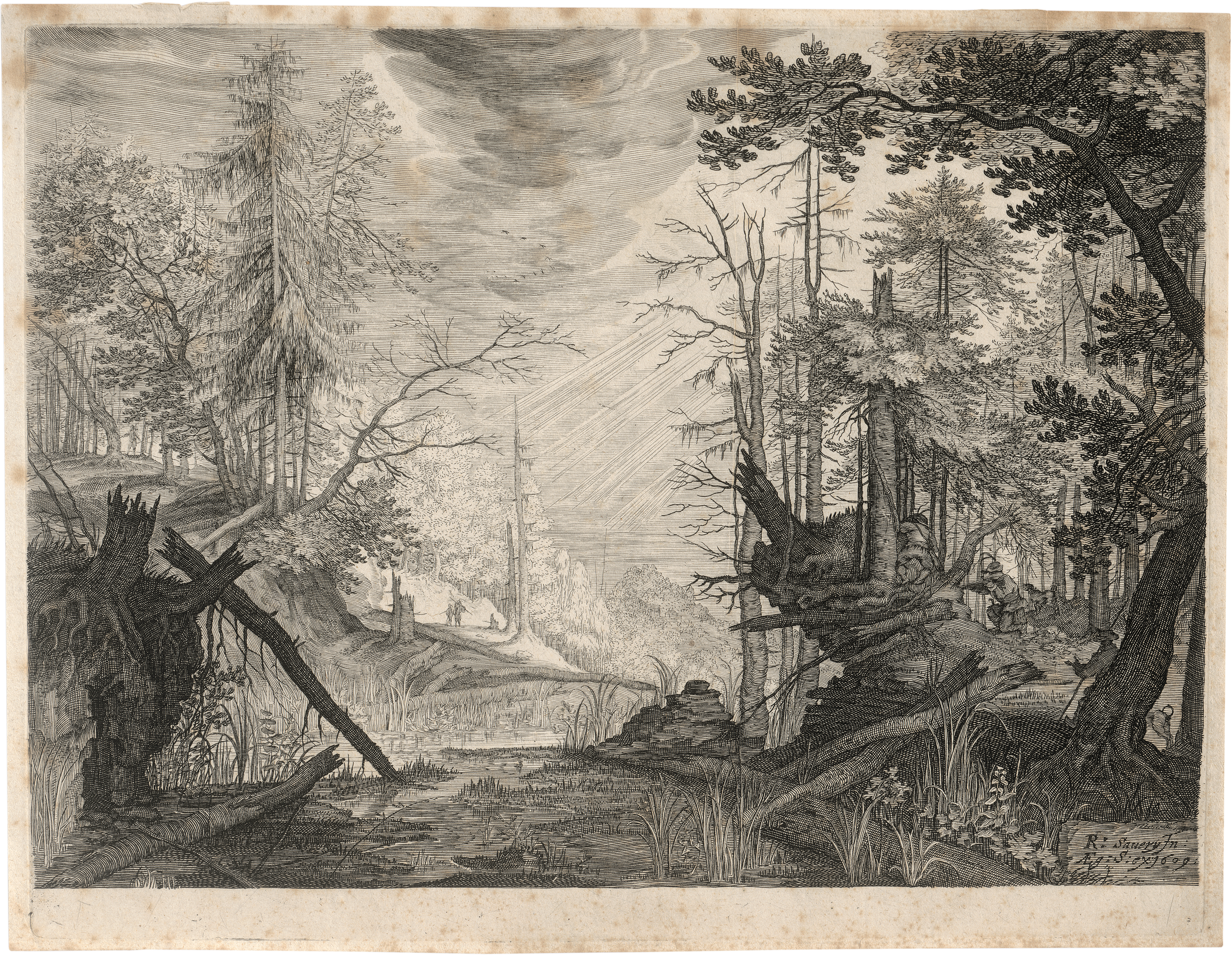 Aus der sechsteiligen Folge "Berglandschaften aus Tirol". Ausgezeichneter, differenzierter Druck mit zartem Plattenton vor der Adresse von Marco Sadeler. Mit feinem Rändchen um die Plattenkante. Stockflecken, Knickfalte in der Ecke oben links, Mittelfalte sowie weitere Knickfalte verso, vertikales Quetschfältchen, sonst gutes Exemplar. Beigegeben drei weitere Landschaftsradierungen: von Sadeler nach Savery (Hollstein 219), von Antonie Waterloo und von Carl Wilhelm Kolbe (Martens 88) sowie von Cornelis Galle nach Erasmus Quellinus "Dornenkrönung".