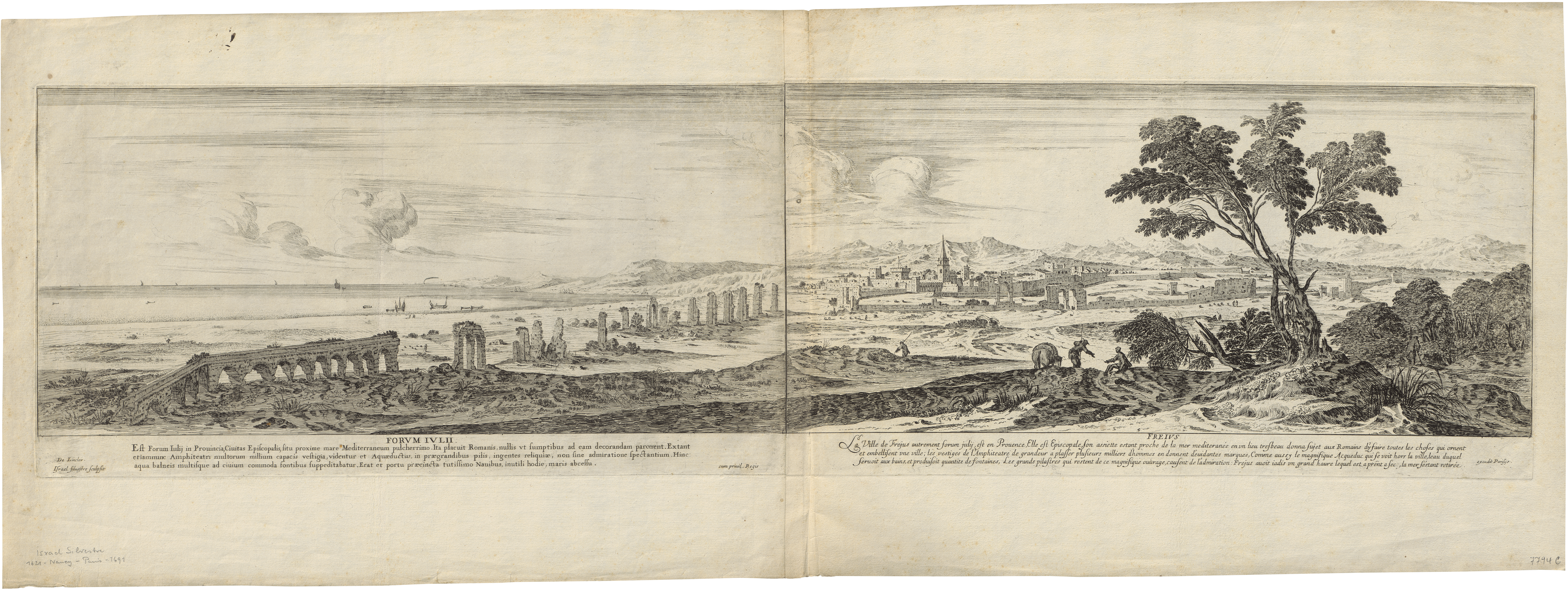 Ansicht der Stadt Fréjus mit dem Forum Julii. Radierung von zwei Platten auf zwei zusammengefügten Bogen. 19,4 x 81,3 cm.