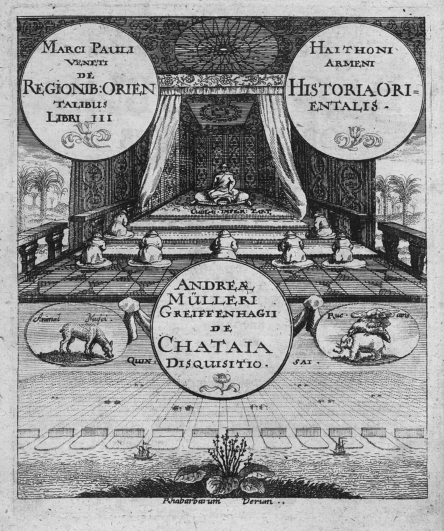 Zwei verschiedene Schriften über orientalische und eine über chinesische Regionen, Bräuche und Sitten. Vorhanden sind: I. Marco Polo. Historici fidelissimi juxta ac præstantissimi, De Regionibus Orientalibus Libri III. 3 Bl., 26 S. Mit gestochenem Titel. Berlin, Georg Schulz, 1671. - II. Haithon Armen. Historia Orientalis: Quae eadem & de Tartaris inscribitur. 2 Bl., 107 S., 4 Bl. O. O. und Dr. 1671. - III. Andreas Müller. Disquisitio geographica & Historica de Chataja. 4 Bl., 115 S., 6 Bl. Mit Kupfertitel. Berlin, Rungian, 1671. – Papierbedingt gebräunt. Teils lose Blätter, leicht stockfleckig und zwei Blätter mit Randläsuren. Das Supralibros auf dem Einband zeigt eine bekrönte und bekränzte Fleur-de-lis.