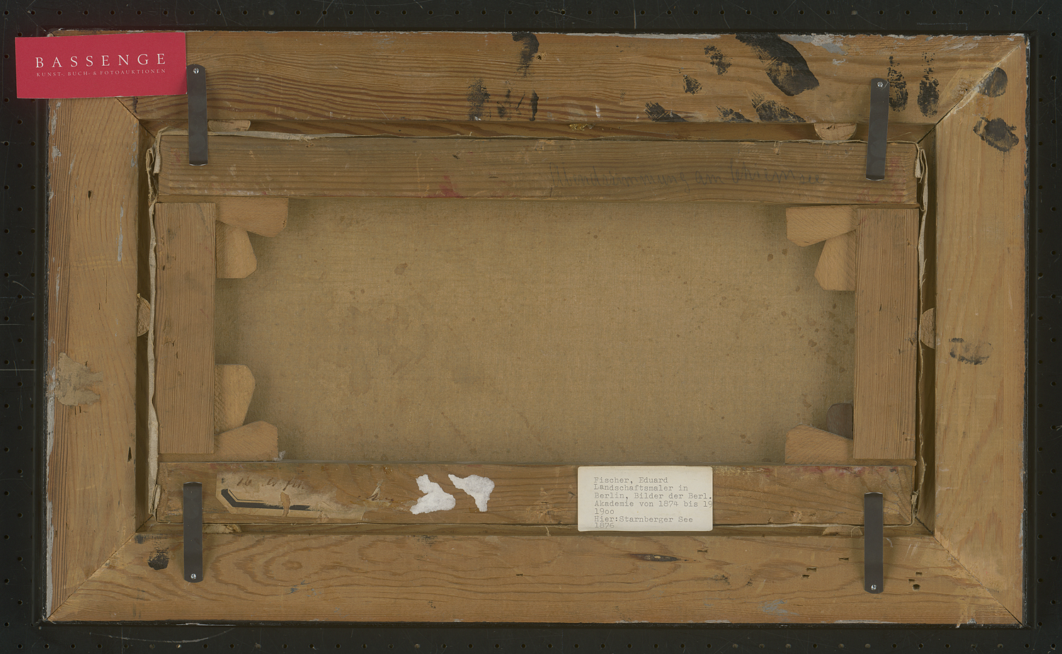 Öl auf Leinwand. 20,5 x 40,4 cm. Unten rechts signiert und schwer leserlich datiert "Ed. Fischer [...6]", verso auf dem Keilrahmen das Fragment eines älteren Künstleretiketts sowie ein maschinenschriftliches Etikett u.a. "Hier: Starnberger See / 1876".