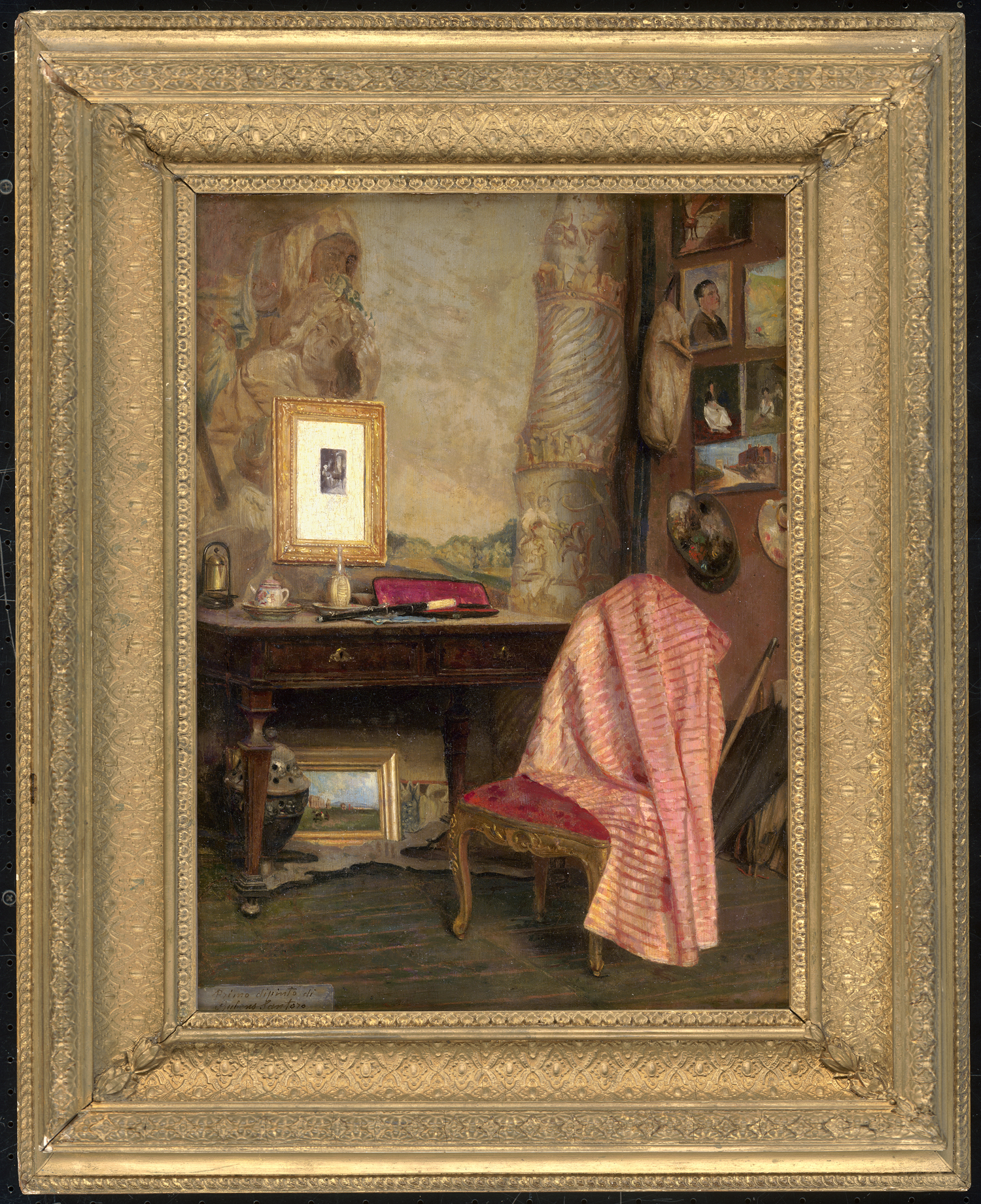 Auf dem Arbeitstisch im Stil Napoléon III. liegt ein geöffneter Kasten, aus dem eine Oboe hervorlugt - ein subtiler Verweis auf die Verbindung von bildender Kunst und Musik. Daneben befinden sich eine kleine Metallkanne, vermutlich zum Erhitzen von Wasser, eine Porzellankanne mit Untertassen sowie eine Glasflasche. Besonders ins Auge fällt eine in einem prächtigen Goldrahmen präsentierte Druckgraphik. Unter dem Tisch lehnt ein Gemälde mit der Ansicht der Aqua Claudia bei Rom. Jede Ecke wird hier offensichtlich als Stauraum genutzt.