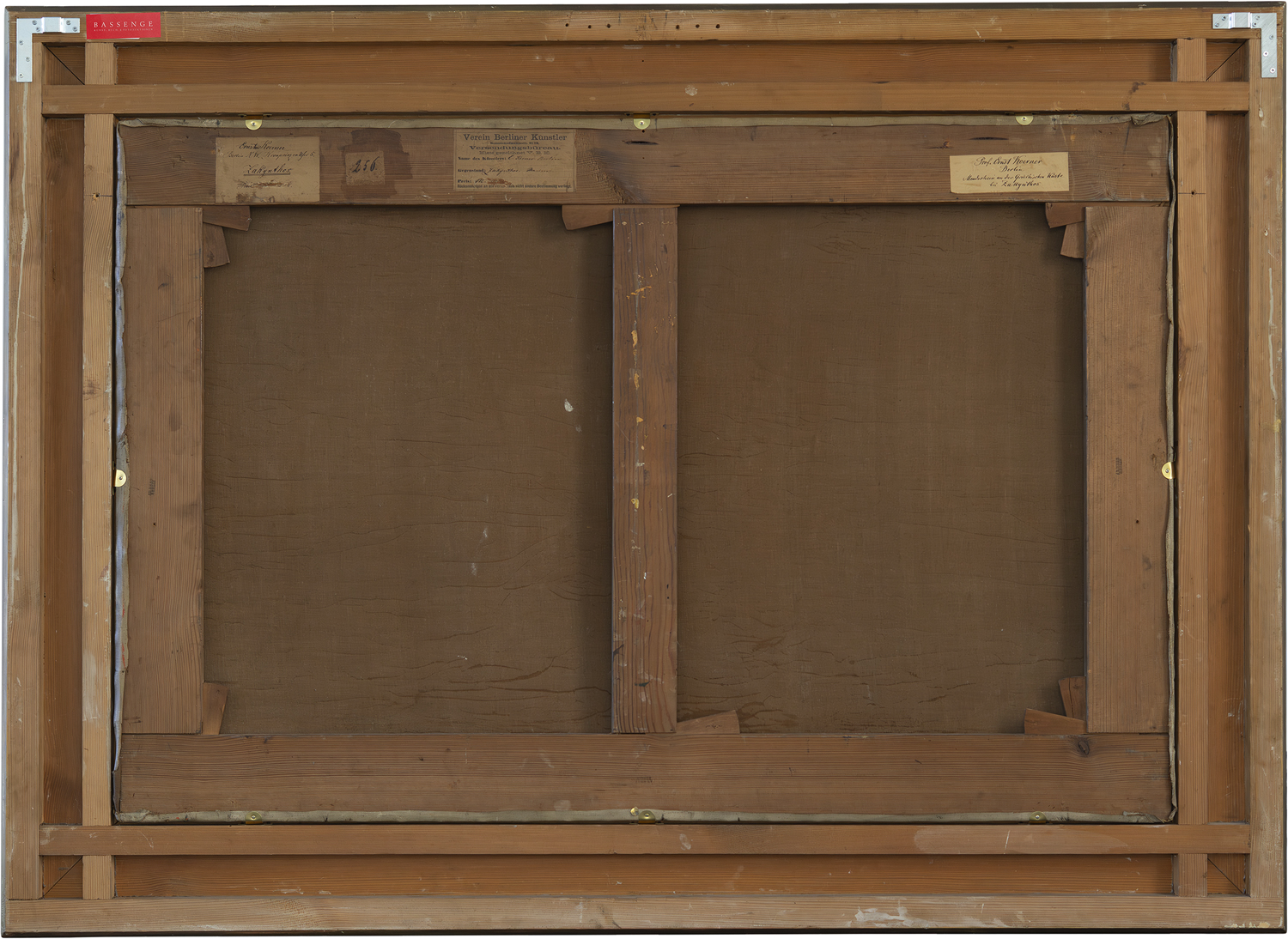 Öl auf Leinwand. 84 x 126 cm. Unten links signiert und datiert "Ernst Koerner 1880", verso zwei handschriftliche Adressetiketten des Künstlers, das Etikett des Vereins Berliner Künstler sowie mehrfach gestempelt "Ad. Hess Berlin".