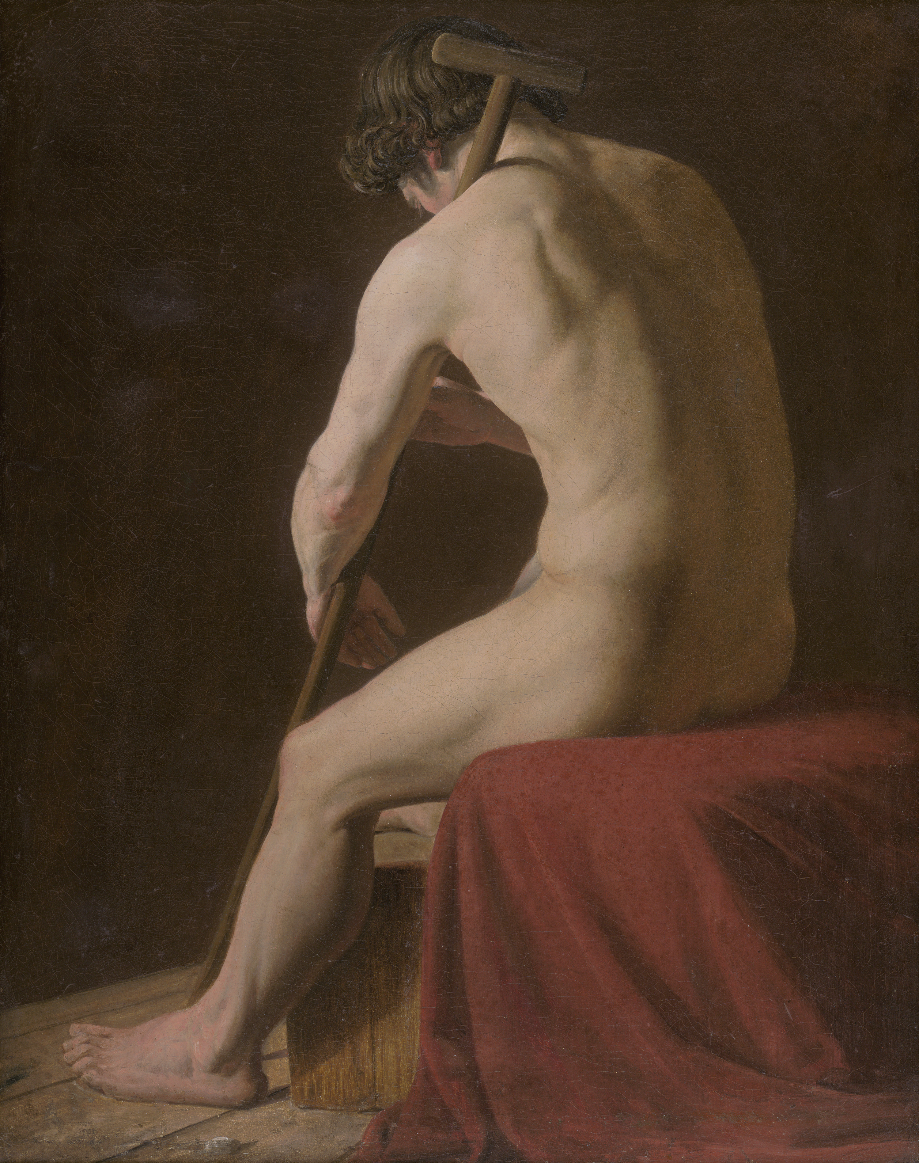 Zum Pflichtprogramm junger Kunsteleven in Kopenhagen gehörte das Malen nach lebendigem Modell in C. W. Eckersbergs Klasse. Besonderen Feinsinn beweist unser Künstler hier bei der tonal fein abgestuften Modellierung der muskulösen Rückenpartie und der differenzierten Wiedergabe von Hell-Dunkeleffekten.