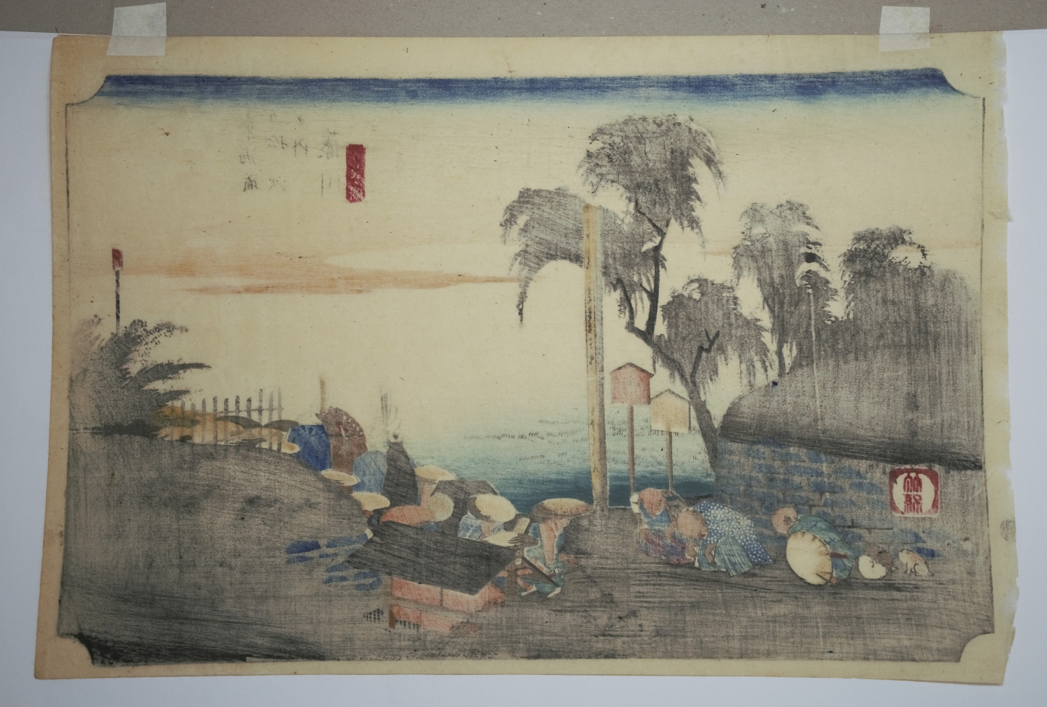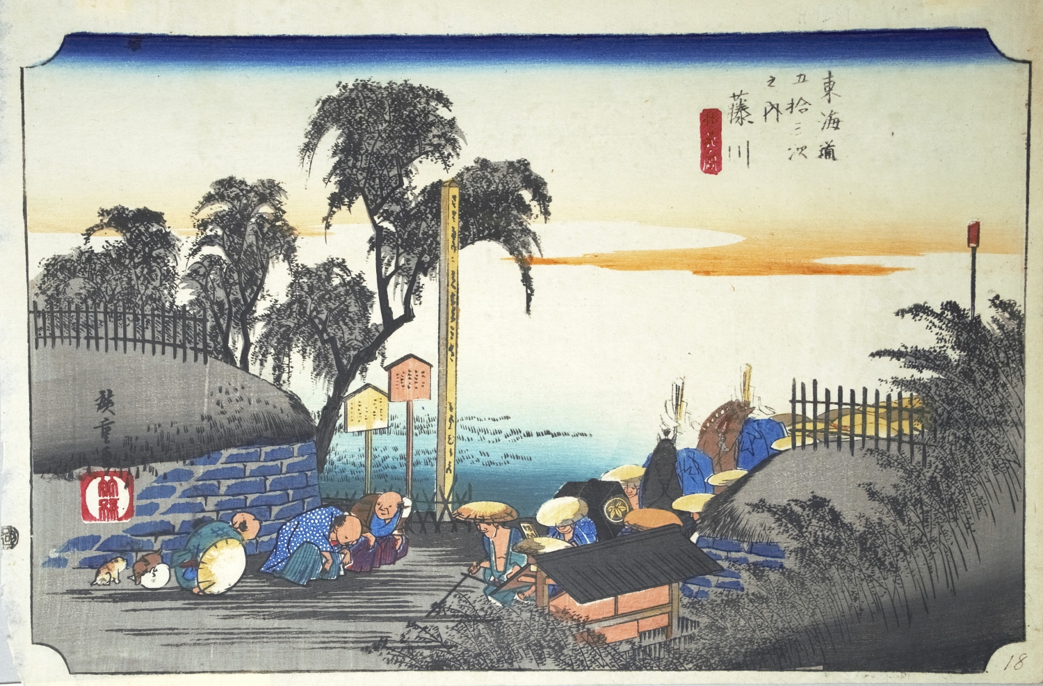 Die Landschaftsdarstellung zeigt Fujikawa, einen Fluss, der von Yamanashi nach Shizuoka fließt. Im Vordergrund verneigen sich Bauern und Dorfbewohner ehrerbietig vor der herannahenden Daimyo-Prozession. Der Himmel, der sich über die Szene spannt, wechselt von einem tiefen Blau zu warmen Orange und geht beinahe nahtlos in den Fluss über. – Im linken weißen Rand mit sehr kleinen Knickspuren, insgesamt in sehr guter Erhaltung.
