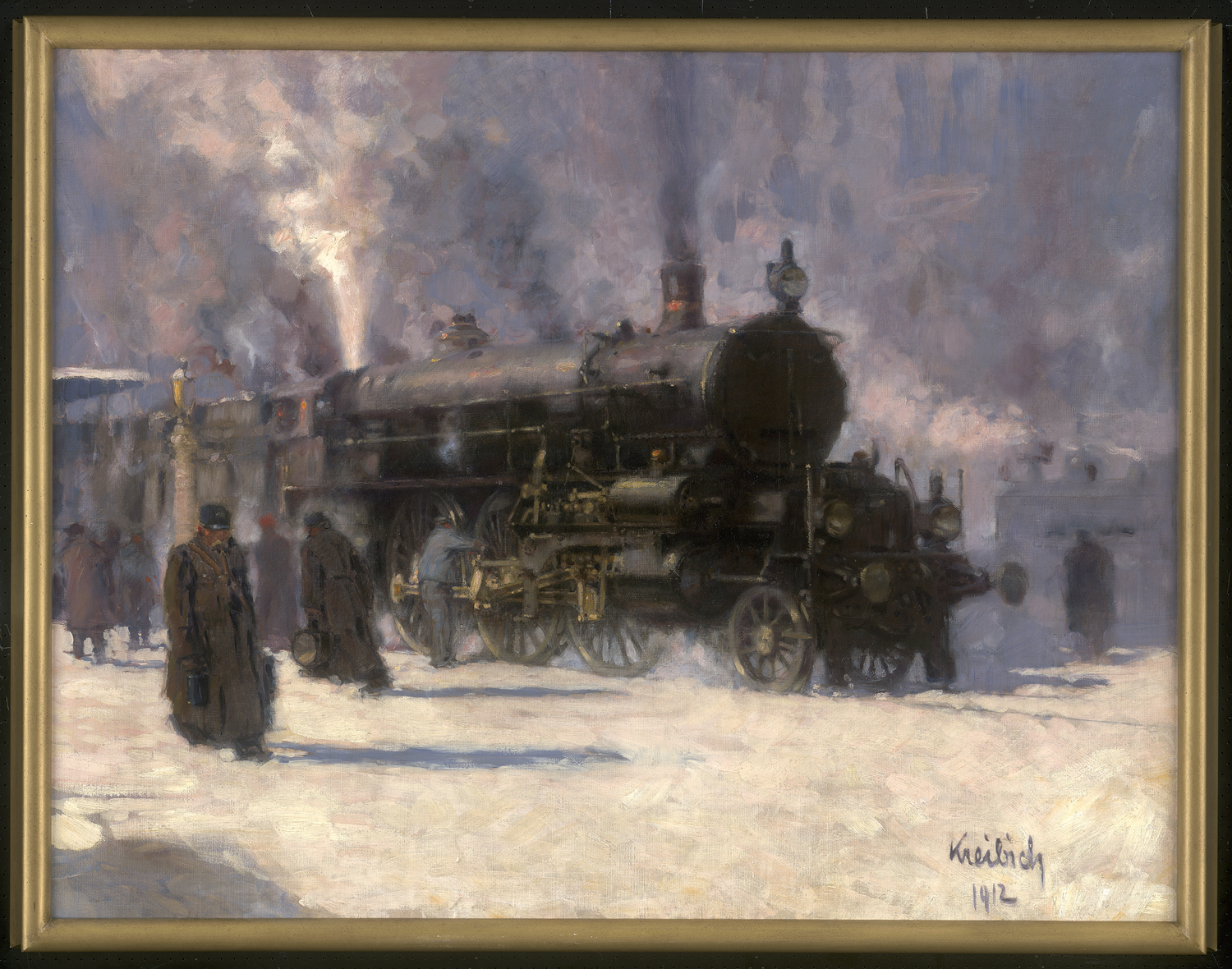 Lot 6206, Auction  126, Kreibich, Vilém, Vor der Abfahrt: Dampfende Lokomotive am winterlichen Gleis