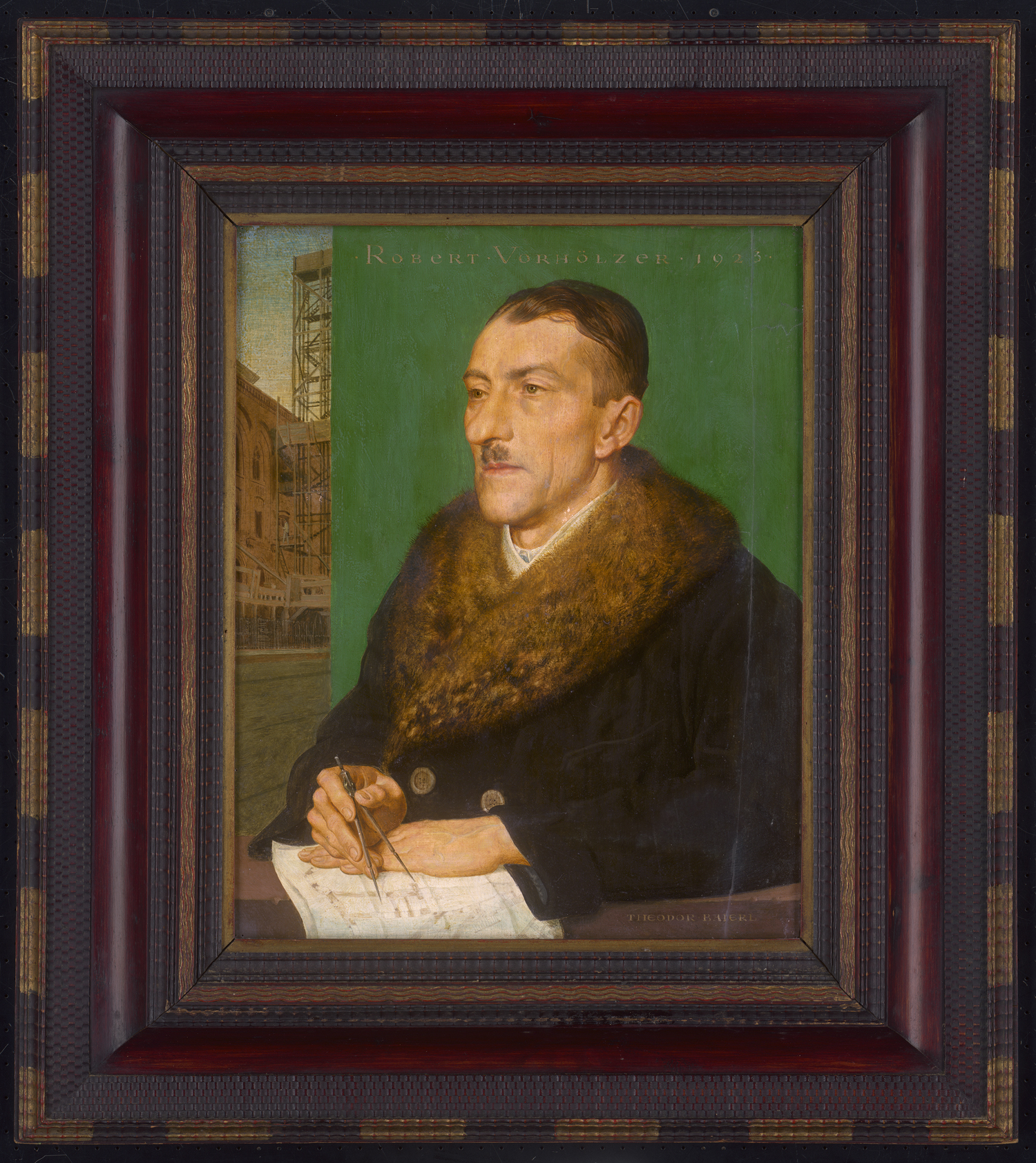 Öl auf Holz. 50,2 x 39,8 cm. Rechts unten signiert "THEODOR BAIERL", oben mittig bezeichnet und datiert "ROBERT VORHÖLZER 1923", verso auf der Tafel und auf dem Rahmen mit Adressetiketten von Tilde Vorhoelzer, verso Stempel der Malbrett- und Rahmenmacher Gebrüder Oberndorfer, München.