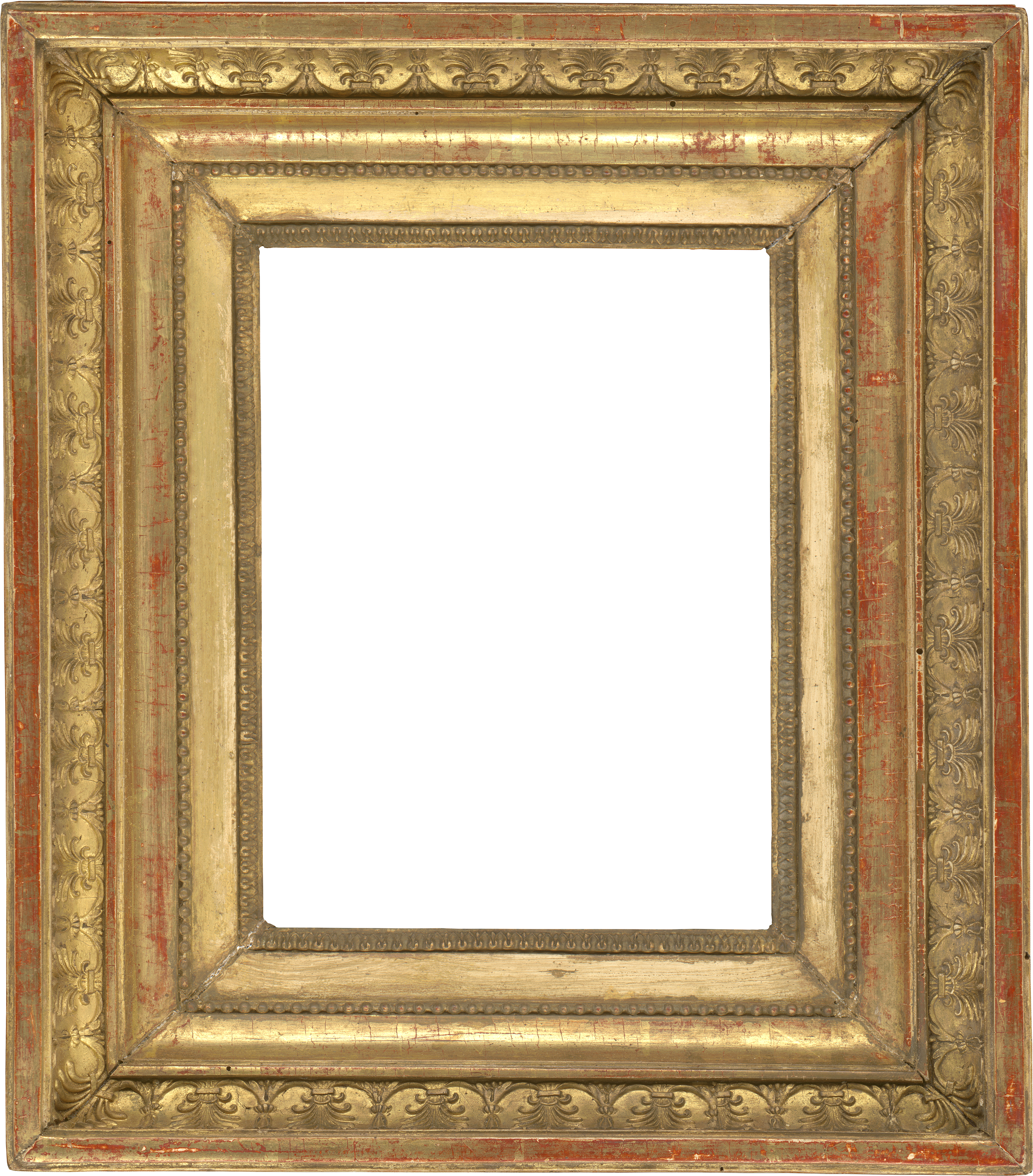 Stuck, vergoldet, Sichtleiste Lotusblattfries, glatte Platte, Perlstab, ansteigende glatte Kehle, ansteigende Kehle mit Palmettenfries, Vierkant als Abschluss.