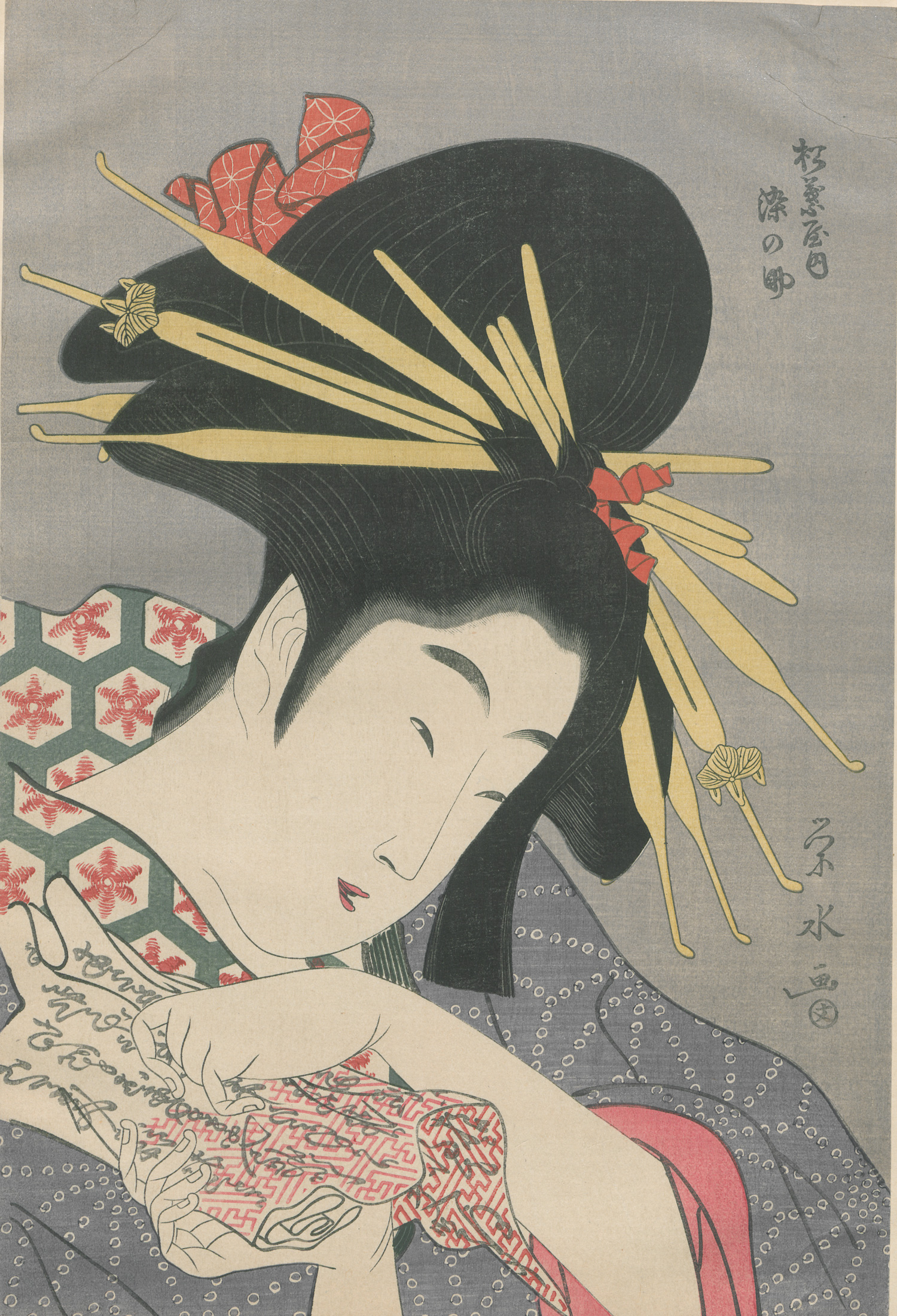 Das Album zeigt eine Auswahl klassischer Ukiyo-e-Motive. Vertreten sind Landschaften Hiroshiges (1797-1858) mit See- und Bergansichten, darunter zwei winterliche Szenerien bei Schnee. Daneben mit figürlichen Darstellungen nach Katsukawa Shunko bzw. Shunsho: vor allem von eleganten Frauen (Bijin), teils Geishas in reich verzierten Kimonos, teils Frauen bei alltäglichen Verrichtungen, etwa beim Wäschewaschen, bei der Morgentoilette oder beim Lesen eines Schriftstücks. – Trägerkarton unten mit nummerischem Stempel. Die Farbholzschnitte teils leicht gewellt oder vereinzelt mit kleinen Flecken, insgesamt jedoch von kräftiger Farbigkeit und gutem Erhaltungszustand.