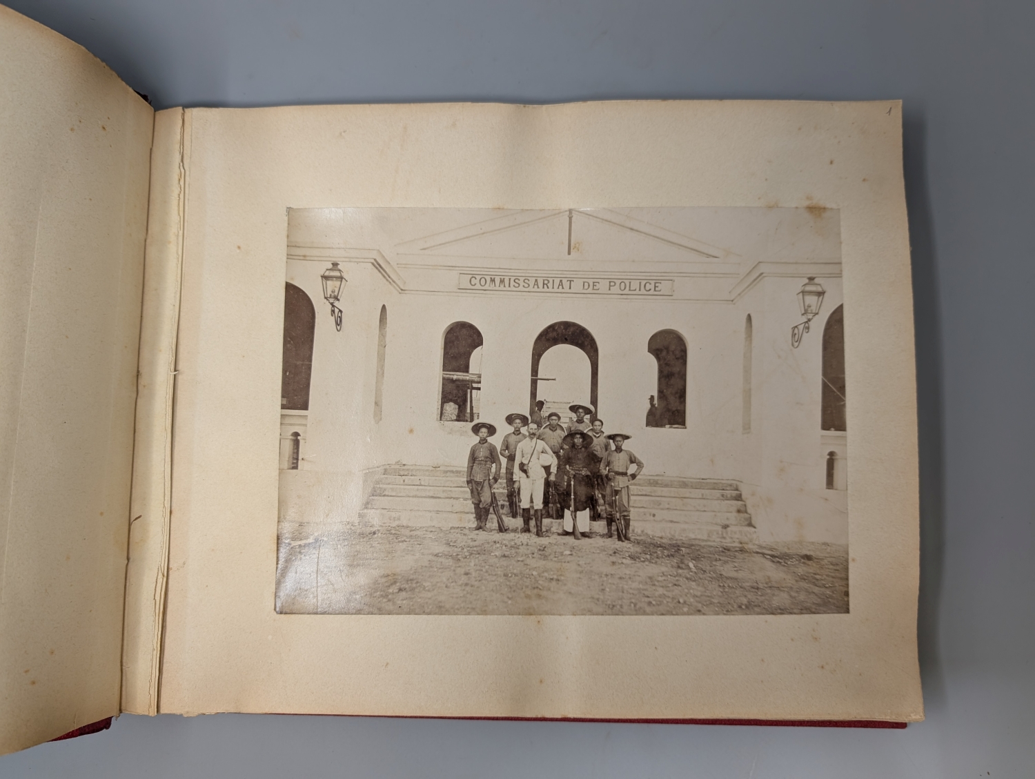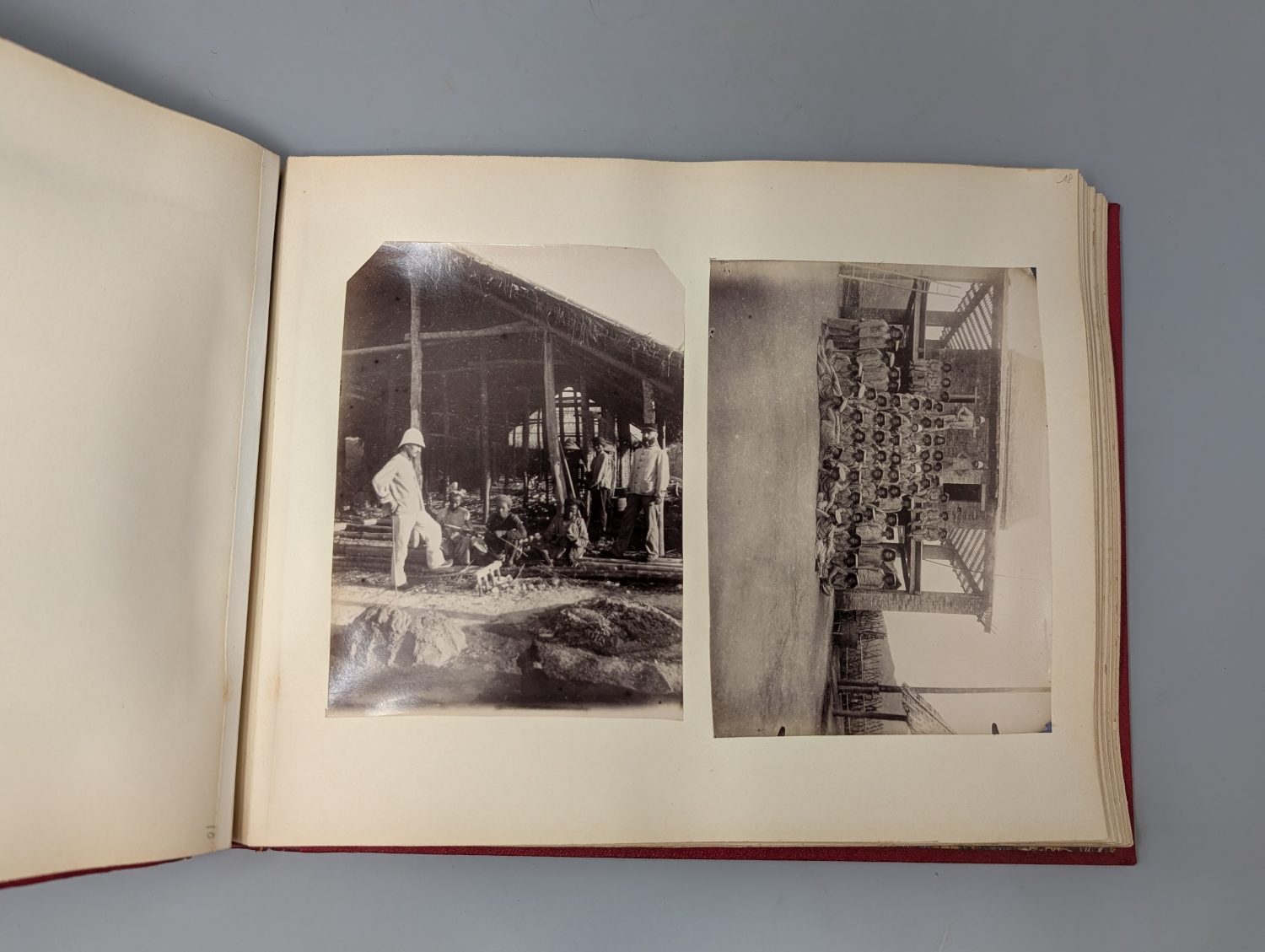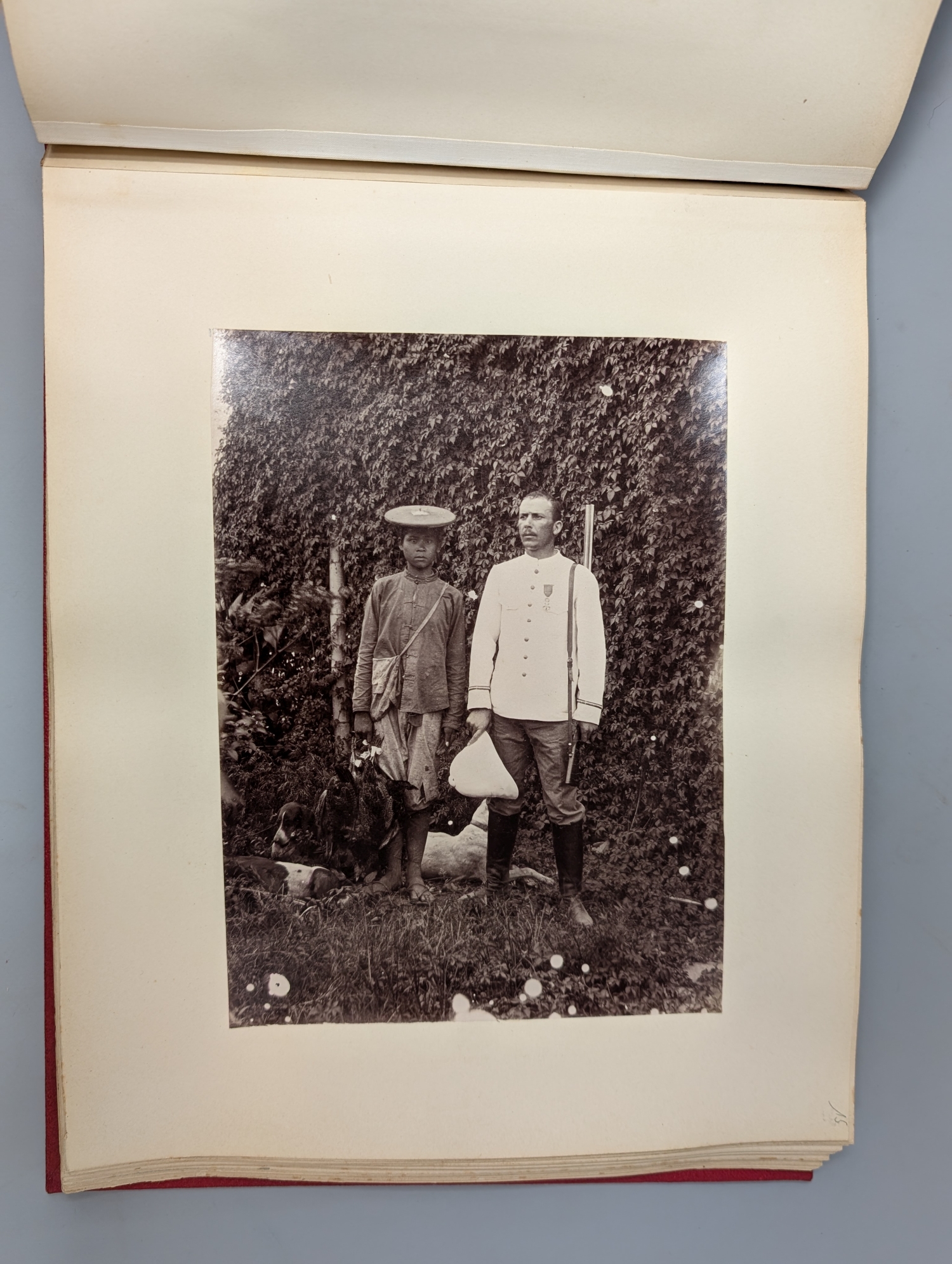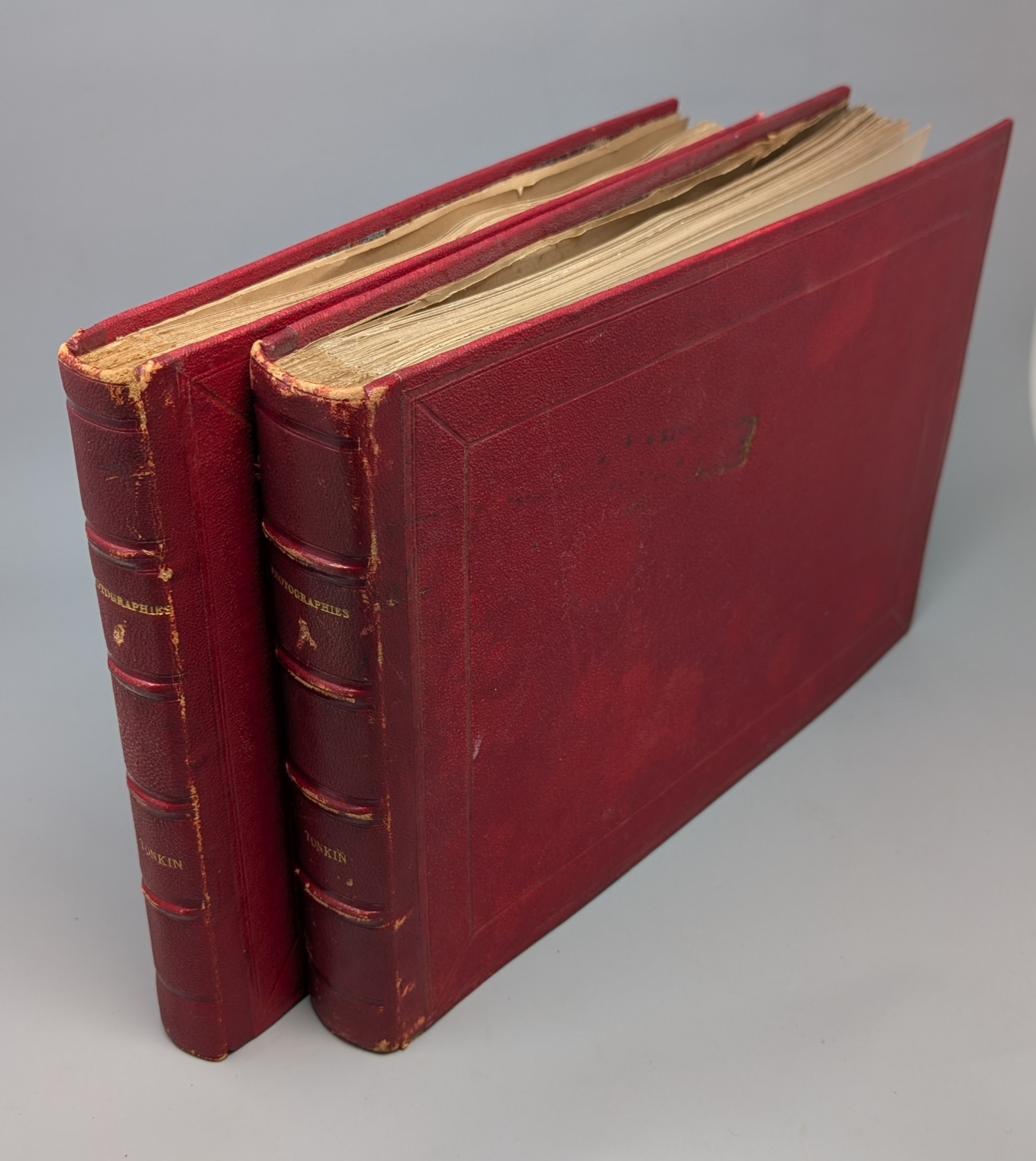Vietnam. Tonkin. 2 Fotoalben mit 163 Fotographien mit Silbergelatine. 8,5 x 11 bis 22,5 x 27,5 cm. Rotes Chagrin-Leder d. Z. (etwas berieben, mit restaurierten Deckeln) mit goldgeprägtem RTitel. Um 1910.