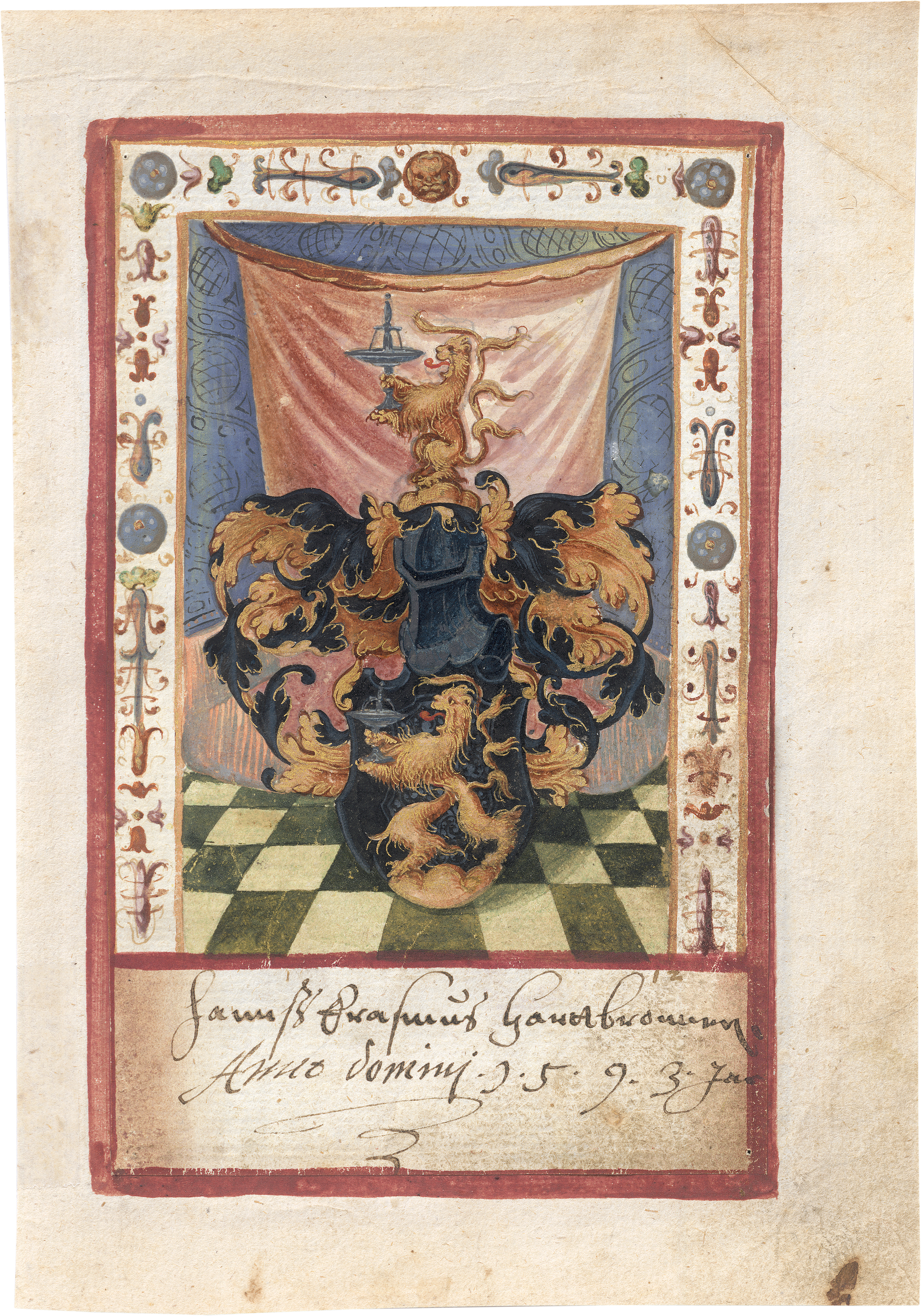 Deckfarben mit Goldhöhung, verso das Wappen der bayrischen Kaufmannsfamilie Hartbrunner (Hartprunner). 9 x 14,2 cm. In ein Papier des späten 16. Jh. eingelassen, dieses mit Wz. Stadttor (Fragment).