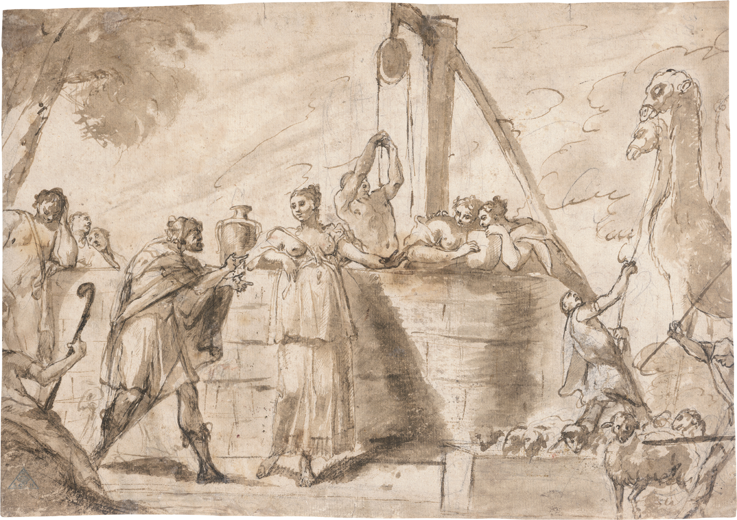 Der venezianische Freskenmaler Giambattista Canal war der Sohn des Malers Fabio Canal (1701-1767), langjährigem Mitarbeiter Giovanni Battista Tiepolos. Giambattista Canal war als Freskenmaler in Venedig, Triest und Ferrara tätig. Sein zeichnisches Œuvre ist noch kaum erschlossen, und es sind lediglich etwa zwei Dutzend Zeichnungen von seiner Hand bekannt. Das vorliegende Blatt schildert eine Szene aus Genesis 24, in der Elieser aus Dank für die Versorgung seines Gefolges mit Wasser der Rebekka eine Kette und zwei Armreifen aus schwerem Gold schenkt. Die charmante Darstellung wird nicht zuletzt durch die von rechts herantrabenden Kamele und die grazile Haltung Rebekkas mit einer elegant humorvollen Note aufgelockert. Der neoklassizistische Ansatz der Zeichnung ist sichtbar verwandt mit den Freskendekorationen im Palazzo Filodrammatico in Treviso von 1804. - Mit einem Gutachten von George Knox, Vancouver vom 29. Juni 2006 (in Kopie vorhanden).