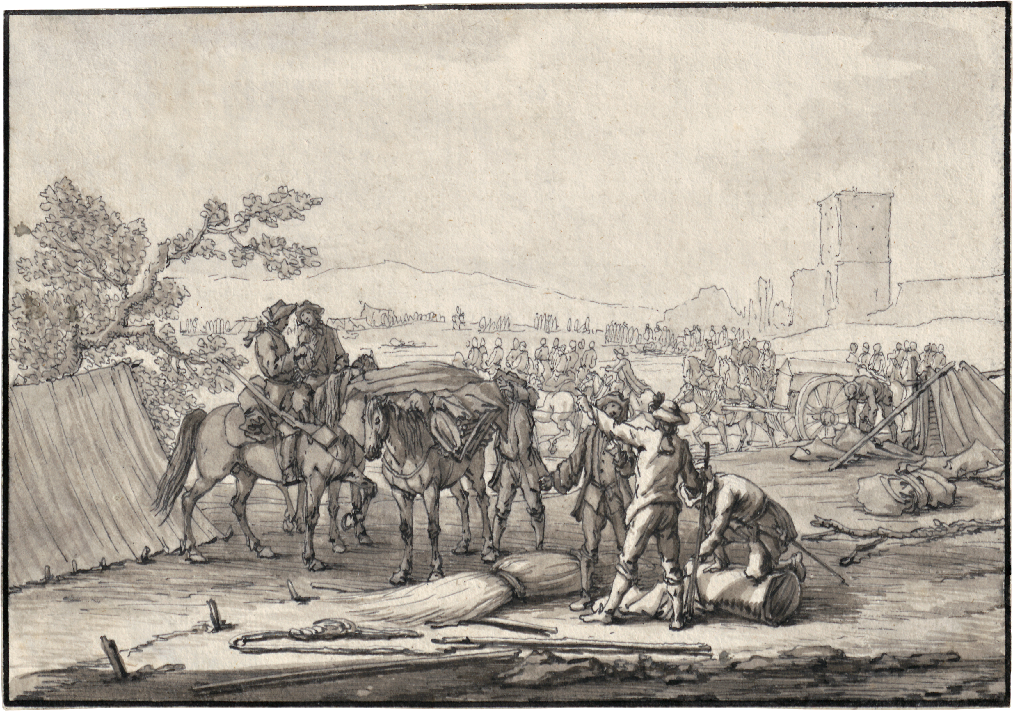 Die Zeichnung gehört zu einer umfangreichen Gruppe in Rugendas' Werk, die in ihrer sachlichen Realistik und in ihrem sorgfältigen Zeichenstil einen wertvollen Einblick in die Arbeitsmethodik des Künstlers bieten. Unter der Reinzeichnung in schwarzer Feder liegt eine leichte Vorzeichnung in Graphit, die jedes Detail der Darstellung mit klar definiert. Die Lavierungen sind treffsicher und visuell wirksam über das Blatt verteilt. Diese Reinzeichnungen dienten häufig als Arbeitsvorlagen, jedoch lassen sie sich nicht immer mit ausgeführten Werken in Verbindung bringen. Aus persönlicher Betroffenheit entstand 1703/04 ein größerer Werkkomplex, der die in diesen Jahren stattfindende Belagerung der Stadt Augsburg durch bayerische und französische Truppen darstellt. Im Spanischen Erbfolgekrieg befahl der bayerische Kurfürst Max Emanuel die Reichsstadt zu belagern und im Anschluss zu besetzen. Rugendas wurde zum Chronisten dieser Ereignisse und übertrug seine Entwürfe in Gemälde, Zeichnungen und Radierungen. Eine mit unserem Blatt in der Komposition und der Figurengruppe identische, allerdings hochformatige Umrisszeichnung in Feder befindet sich in den Staatlichen Kunstsammlungen Augsburg (Inv. Nr. G 5595).