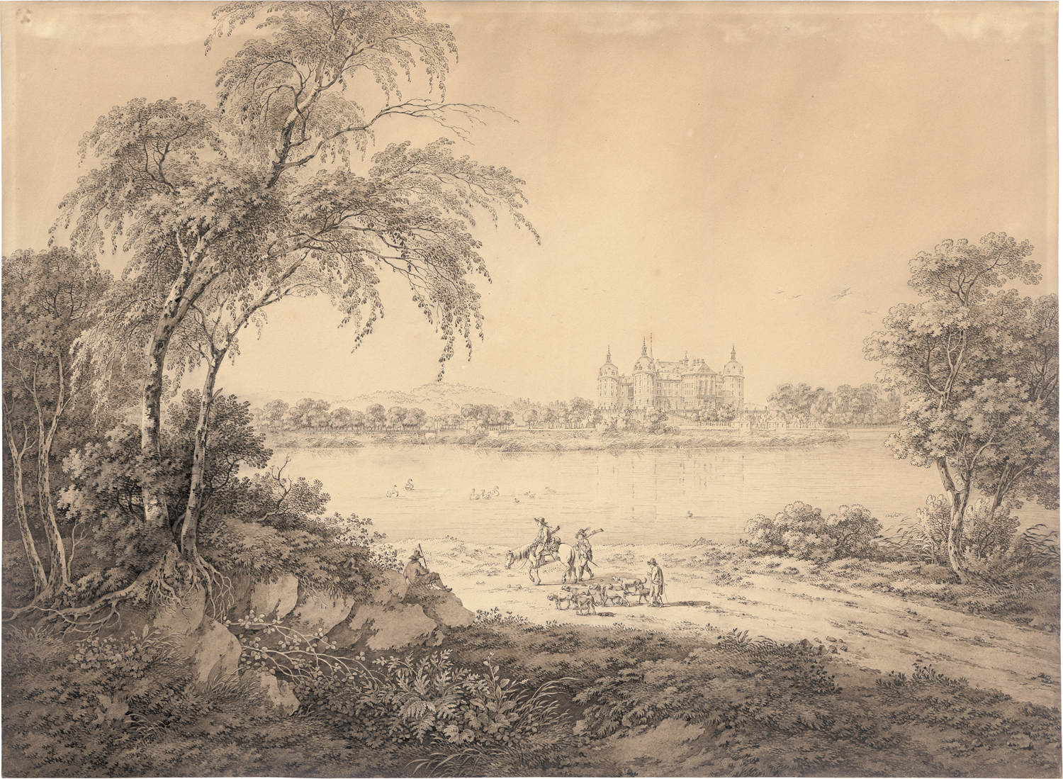 Die repräsentative, bildmäßig ausgeführte Zeichnung zeigt den Blick auf Schloss Moritzburg mit seinen markanten Türmen über den Schlossteich hinweg. Die imposante barocke Schlossanlage liegt auf einer künstlich geschaffenen Insel, die über einen schmalen Damm erreichbar ist. Der Vorläufer des Schlosses war das ehemalige Jagdhaus von Herzog Moritz von Sachsen, von dem sich auch der Name herleitet. Die kleine Jagdgesellschaft im Vordergrund illustriert diesen ursprünglichen Zweck des Schlosses feinsinnig. Von dieser Ansicht existieren kolorierte Umrissradierungen kleineren Formats, die auf die Beliebtheit des Motivs schließen lassen (s. Ausst. Kat. Adrian Zingg. Wegbereiter der Romantik, hg. von Petra Kuhlmann-Hodick, Claudia Schnitzer, Bernhard von Waldkirch, Dresden 2012, S. 208, Nr. 98-99).