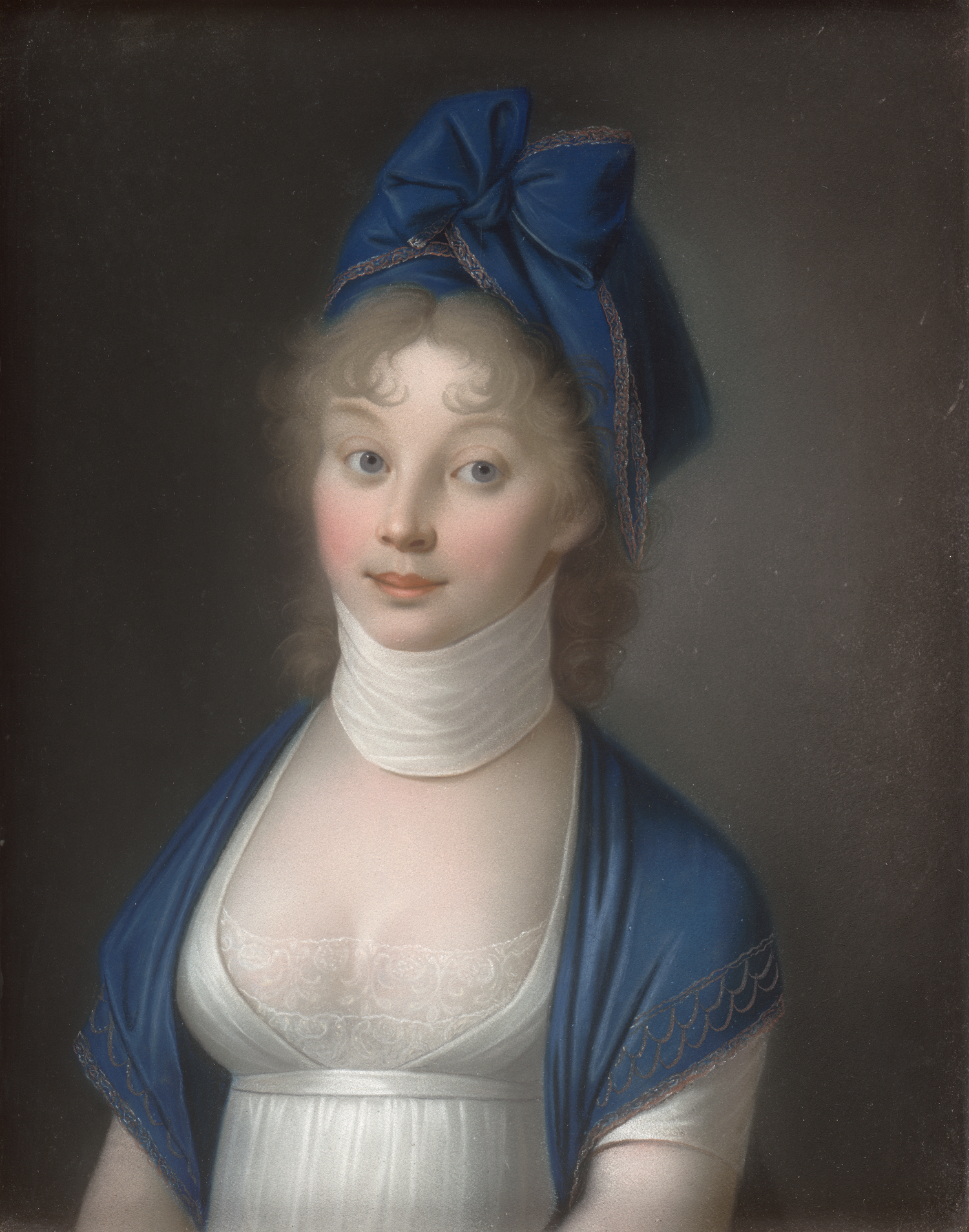 Als die mecklenburgische Prinzessin Luise 1793 als Verlobte des preußischen Kronprinzen in Berlin ankam, war der Grundstein zu ihrer bis heute anhaltenden verklärten Popularität, ja kultischen Verehrung, gelegt. Doch darf über diese Mythisierung nicht vergessen werden, dass sich Luise im Gegensatz zu ihrem zaudernden Ehemann Friedrich Wilhelm III. auch als weitsichtige Politikerin auszeichnete. In den Jahren napoleonischer Expansion und preußischer Zögerlichkeit setzte sie sich entschieden für ein Bündnis mit Russland und Österreich ein, suchte und verhandelte mit Bundesgenossen und förderte nach der schmachvollen Niederlage Preußens maßgeblich fortschrittliche Reformer. Aufgrund ihrer Beliebtheit entbrannte über alle Stände hinweg eine große Nachfrage nach Porträts der jungen Monarchin. Am Hofe erkannte man, dass sich mittels einer gesteuerten Bildproduktion die Außenwirkung des preußischen Königshauses beeinflussen ließe. Einfache, lebensnahe Inszenierungen und der Verzicht auf Herrschaftszeichen sollten das Bild einer bürgernahen, progressiven Monarchie zeichnen. Diese Nachfrage bediente unter anderem der Künstler Nikolaus Lauer mit Werken von herausragender Qualität. Lauer hatte seit 1791 eine Stellung als Hofmaler beim Pfalzgrafen von Birkenfeld-Zweibrücken inne, doch zwang ihn das Vorrücken der napoleonischen Truppen 1794 zum Umzug nach Leipzig und Dresden. Aus dem Jahr 1799 hat sich eine Zeitungsannonce erhalten, in der Lauer seine Bildnisse des preußischen Königspaares ankündigt. Von den vorliegenden Brustbildnissen sind mehrere eigenhändige Fassungen bekannt (vgl. Thomas Wiercinski: Der Pastellmaler Nikolaus Lauer. 1753-1824. Werkverzeichnis, St. Wedel 2004, Kat. 54-59, 63, 68, 70). Die Urfassung von Luises Porträt, das die Königin modisch gekleidet in einem weißen Chemisekleid mit der ikonischen Halsbinde sowie einem Schal und Kopftuch in tiefem Blau zeigt, hing in Schloss Monbijoux und gilt als kriegsbedingter Verlust. Eine engverwandte Version ist heute im Schloss Pfaueninsel zu sehen (SPSG, GK I 40618).