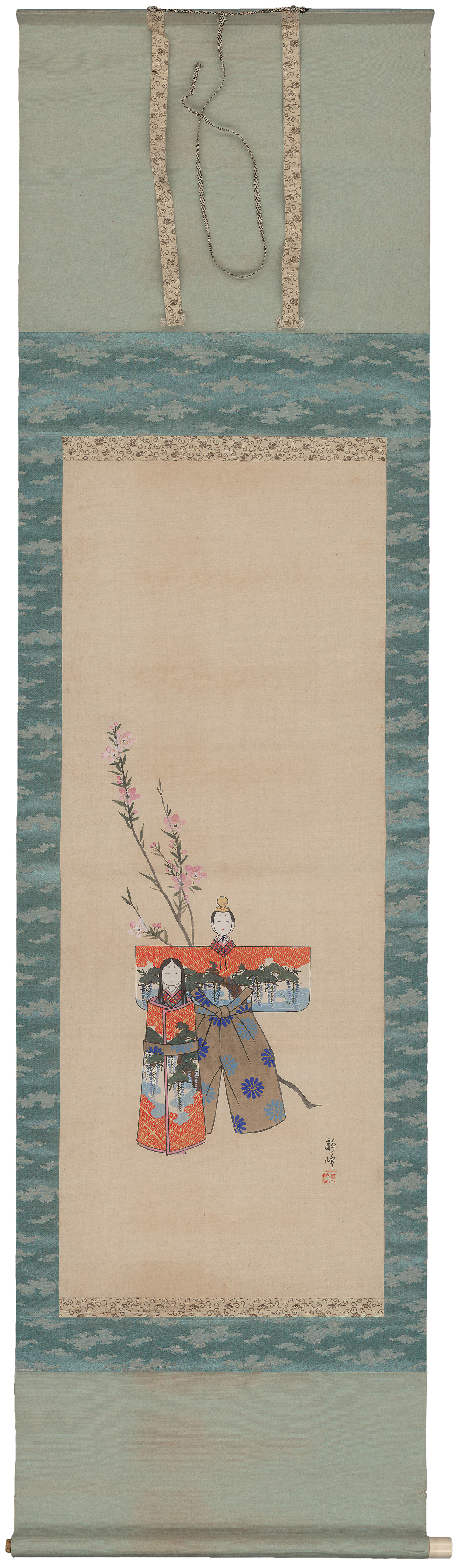 O-Dairi-sama und O-Hina-sama. Japanisches Kakemono-Rollbild eines kaiserlichen Hina-Puppenpaares. Farbige Pinselzeichnung auf Leinen, rechts unten mit rotem Künstlerstempel. 170 x 45,5 cm. Mit hellblauem Brokatpapierrahmen in Wolkenornamentik. Gerollt auf Spindel (Durchmesser: 2,2 cm), oben mit Stift und schwarz-weißem Aufhängeband. Japan frühes 20. Jahrhundert.