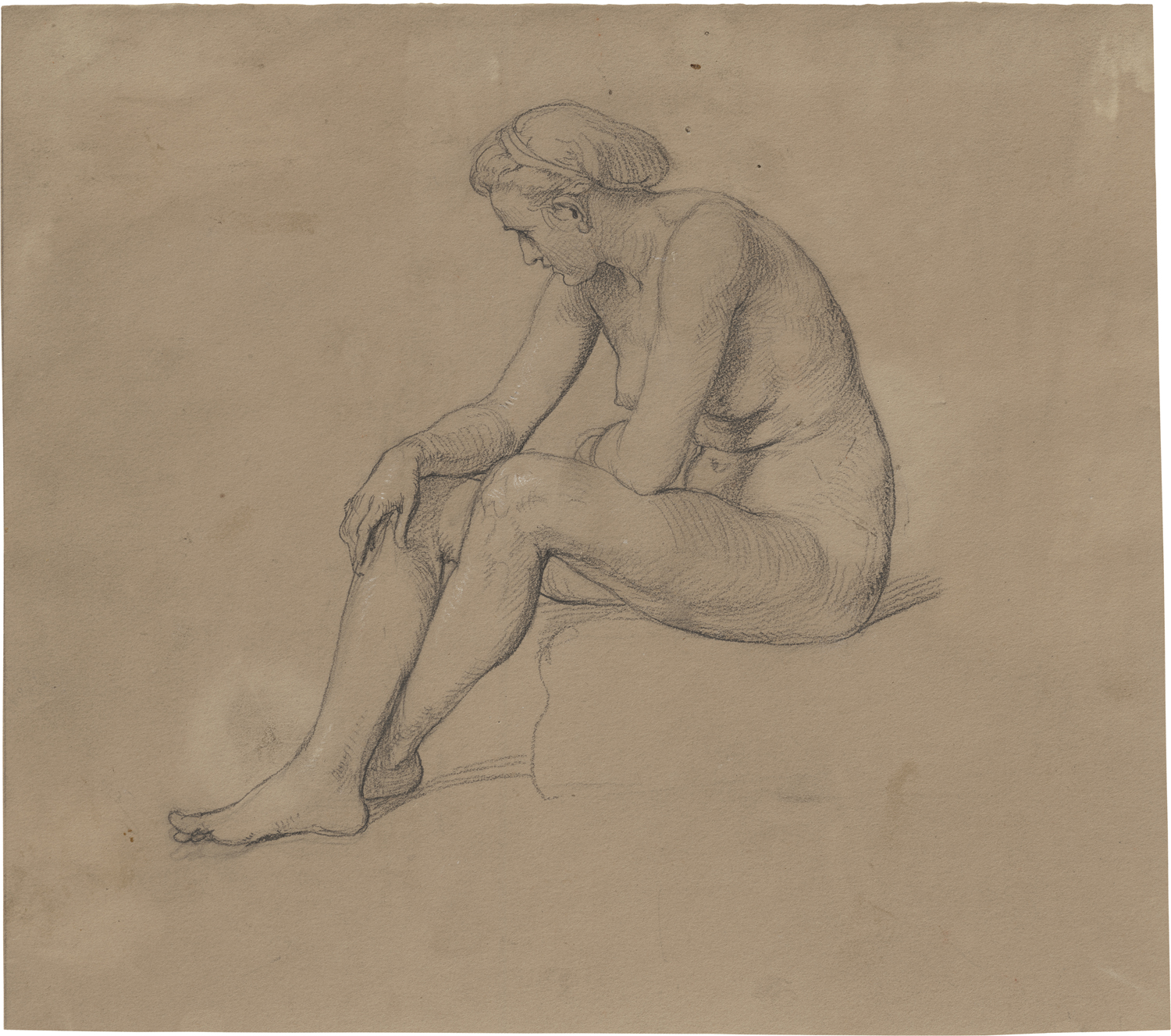 Bleistift, weiß gehöht, auf bräunlichem Velin, entlang des Oberrandes montiert. 20,5 x 23,3 cm.