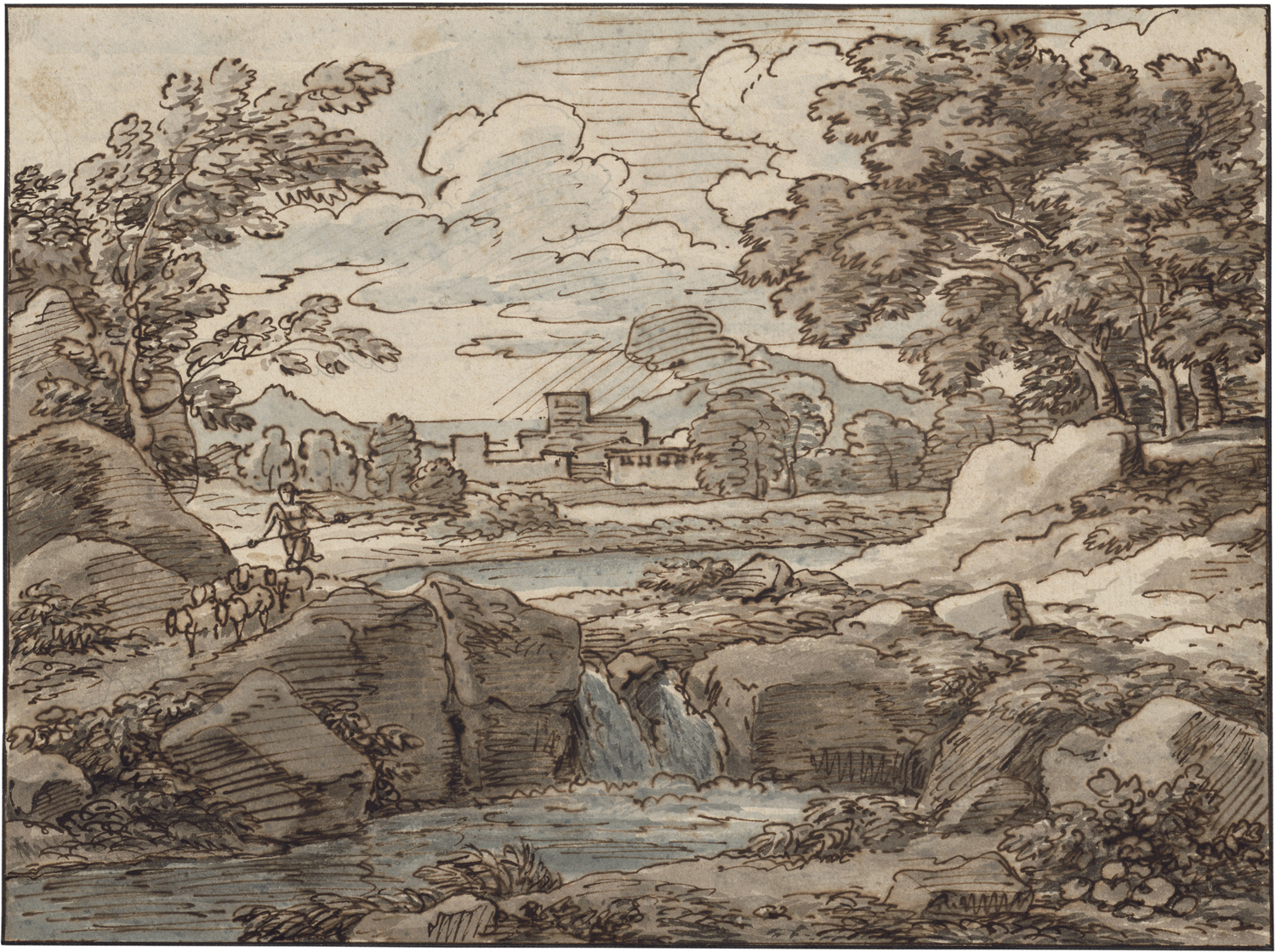 Die bravourös gezeichnete Ideallandschaft entstammt der reifen Schaffenszeit Reinharts und dokumentiert in ihrer kompositorischen Struktur die intensive Auseinandersetzung mit dem Werk seines großen Vorgängers Gaspar Dughet, von dem der Künstler ein Gemälde besaß. Johann Christian Reinhart, der sich 1789 in Rom niedergelassen hatte, gehörte gemeinsam mit Joseph Anton Koch zu den angesehensten Vertretern der deutschen Künstlerschaft in der Heiligen Stadt, wo er bis zu seinem Tode leben und arbeiten sollte. Die vorliegende Zeichnung besitzt in ihrem virtuosen Duktus und Spontaneität der Linienführung alle Merkmale der prima idea. Die Studie diente als Vorbereitung für das 1824 vollendete Gemälde Ideallandschaft mit Hirt und Ziegen, das heute in der Neuen Pinakothek in München aufbewahrt wird (Inv.Nr. WAF 817). Das Werk muss für den Künstler einen hohen Stellenwert besessen haben, denn es sind mehrere sorgfältig komponierte, bildmäßig ausgeführte Zeichnungen überliefert (siehe Ausst. Kat. Johann Christian Reinhart. Ein deutscher Landschaftsmaler in Rom, hrsg. von H. W. Rott, A. Stolzenburg und F. C. Schmid, Hamburg, Kunsthalle, München, Neue Pinakothek, 2013, S. 302-303).