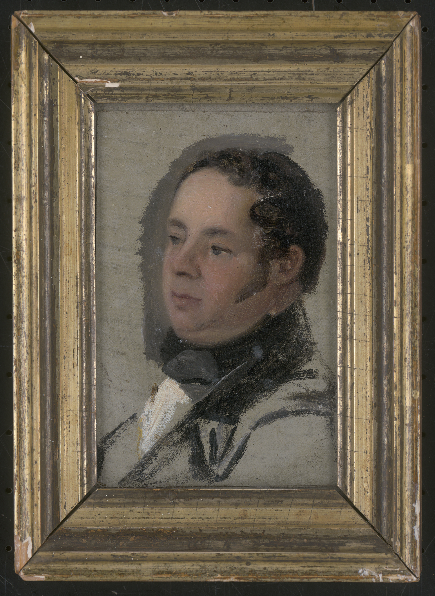 Öl auf Leinwand, auf Karton kaschiert. 15 x 9,5 cm. Verso auf dem Rückdeckel in Bleistift von alter Hand bez. "Louis Drucker von Jentzen gemalt", ferner mit montiertem Zettel mit handschriftl. Annotation von Dr. Ernst Küttner und einem weiteren Etikett mit Angaben zu dem Werk.