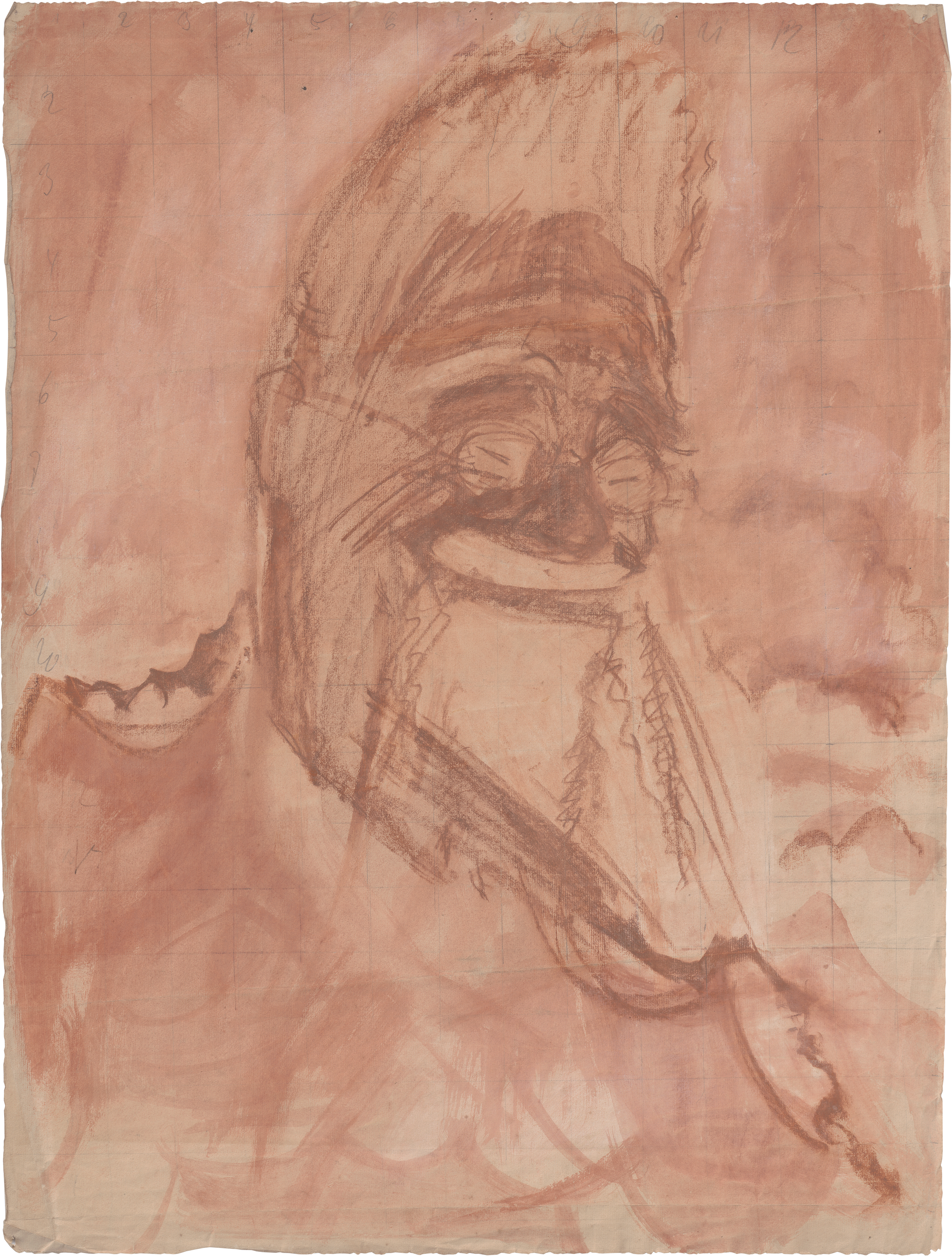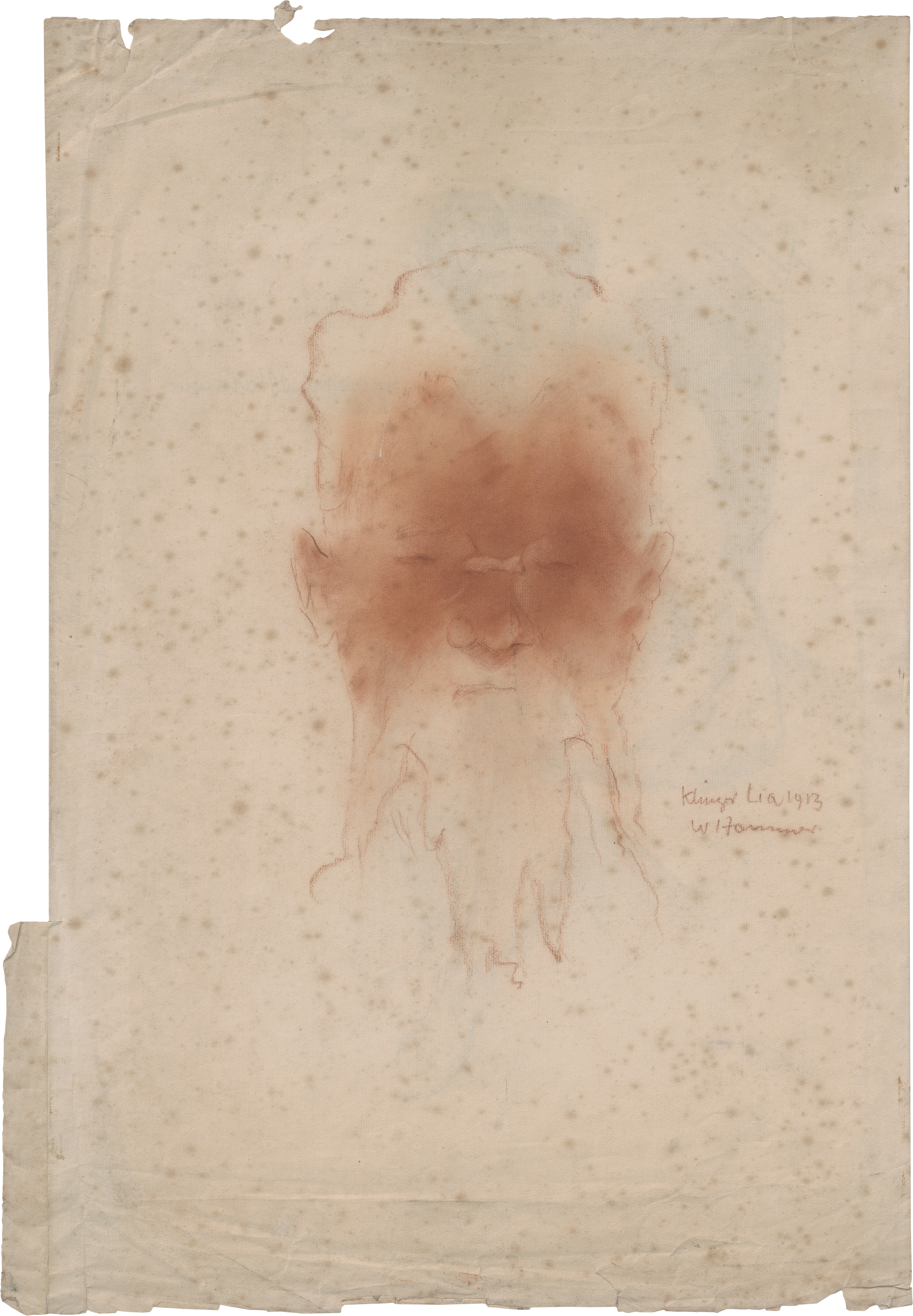 Die Zeichnung entstand in Vorbereitung zu einer der vier humorigen Radierungen, die Hammer nach 1913 von Max Klinger herstellte. Beigegeben von demselben die Vorzeichnung in Rötel zur Radierung "Max Klinger, blinzelnd" (vgl. Bassenge Auktion A123 am 3. Juni 2024, Los 6436), bezeichnet, signiert und datiert "Klinger 1913 / W Hammer", verso mit einer signierten Aktstudie in schwarzer Kreide.