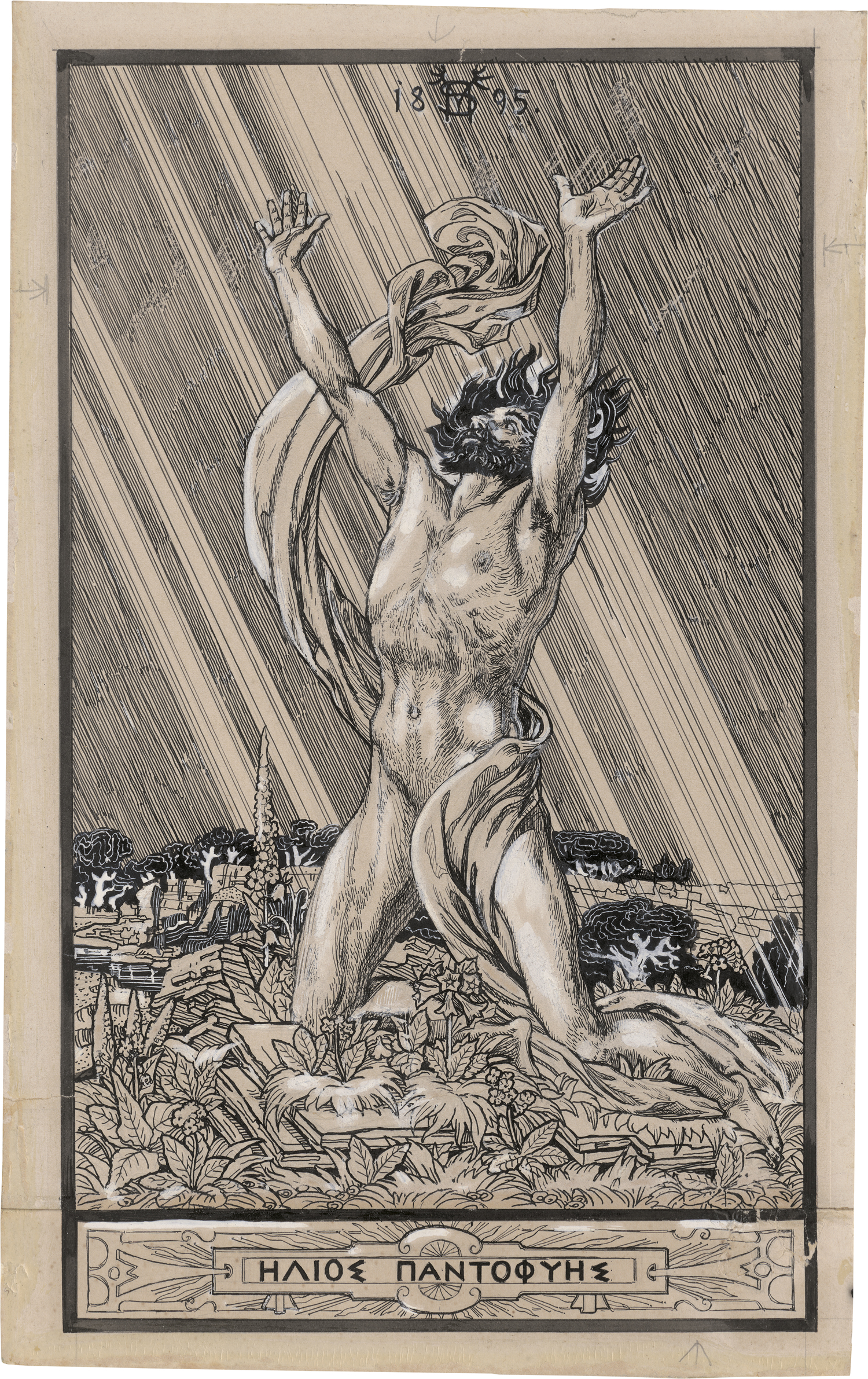 Feder in Schwarz über Bleistift, weiß gehöht, aufgezogen. 29,3 x 17,2 cm. In der Darstellung oben monogrammiert und datiert "18MS05" und unten in griechischen Buchstaben bezeichnet "ΗΔΙΟΣ ΠΑΝΤΟΦΥΗΣ".