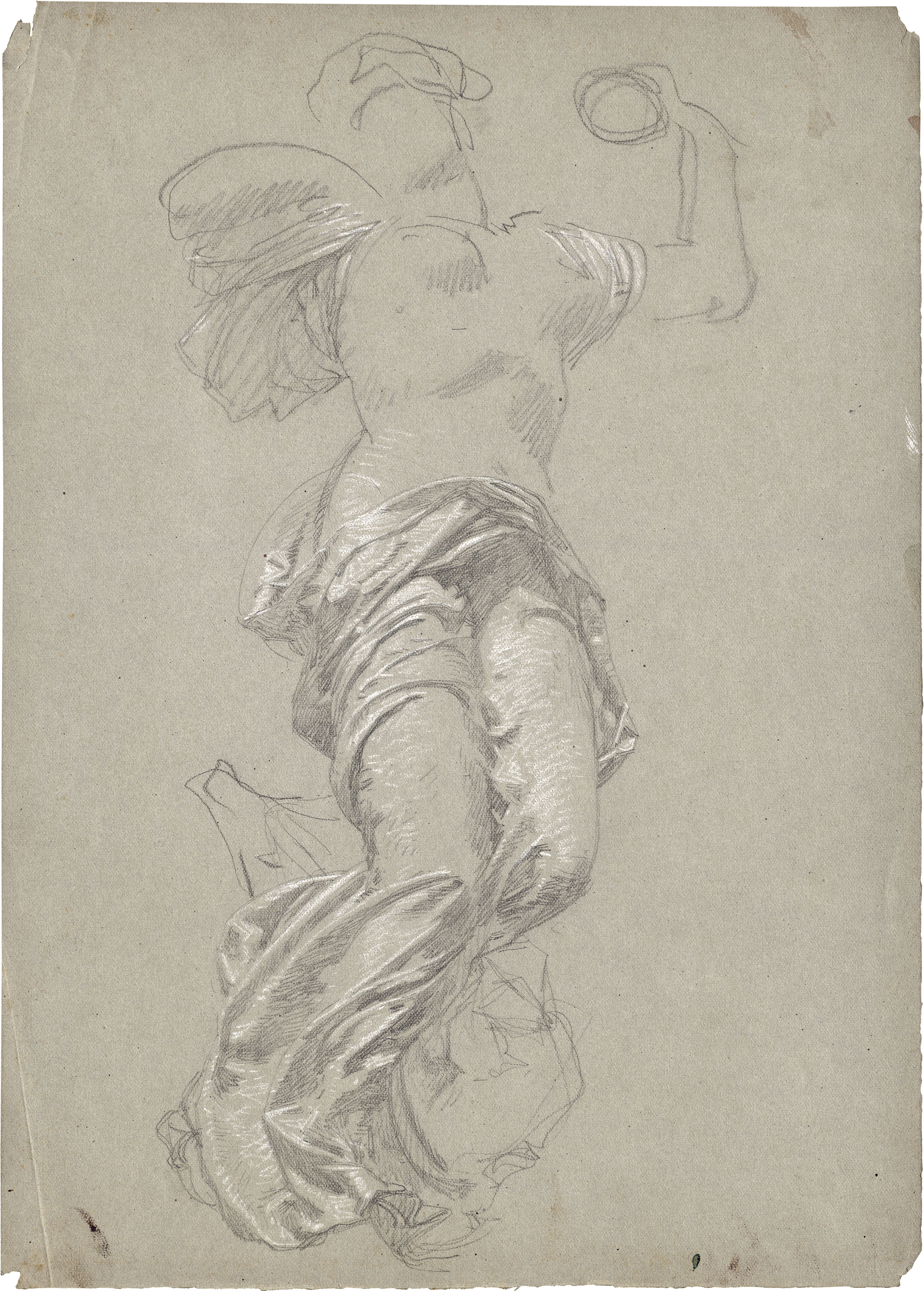 Graue und weiße Kreide auf grau-grünem Velin. 32,6 x 23,4 cm.