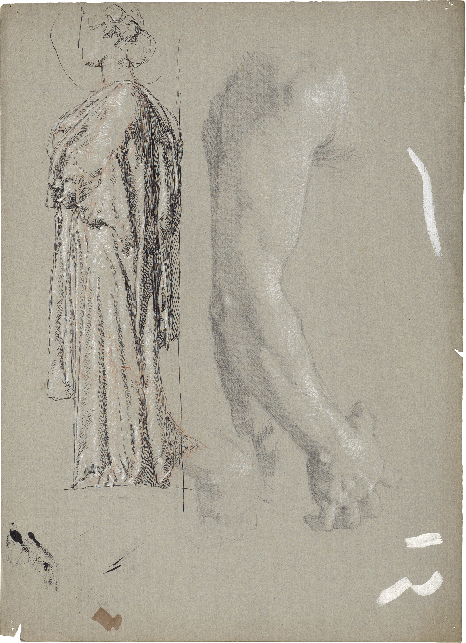 Studienblatt mit weiblicher Figur im antiken Gewand und Armstudie.