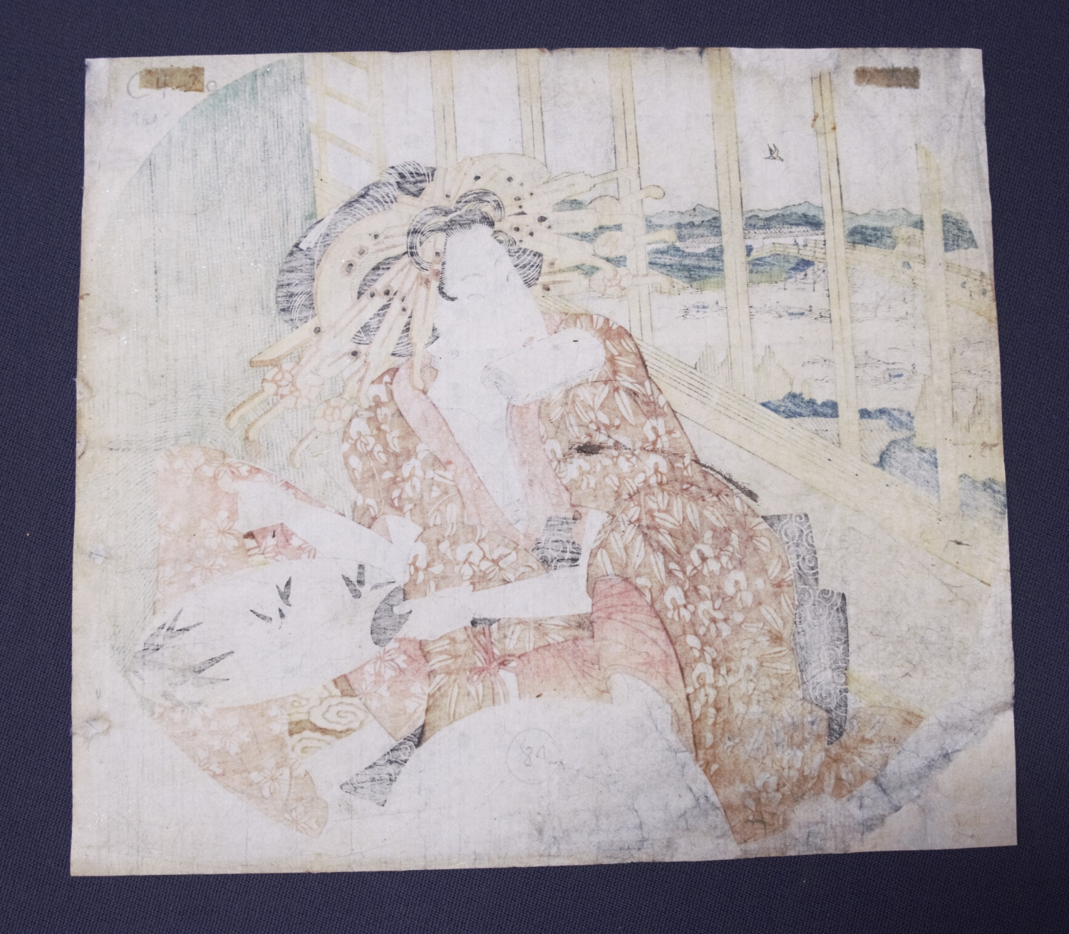 Der Japaner Utagawa Toyokuni (1769-1825) gilt als einer der wichtigsten Holzschnittkünstler des 18. Jahrhunderts und prägte die Utagawa-Schule mit seinem Malstil. – Fragmentarisch erhalten. Hinterlegt, etwas berieben knittrig. Kleine Säurespur durch die Klebestreifen. Stark restauriert, verso mit neuerem Papier fachmännisch verstärkt uns ausgebessert.