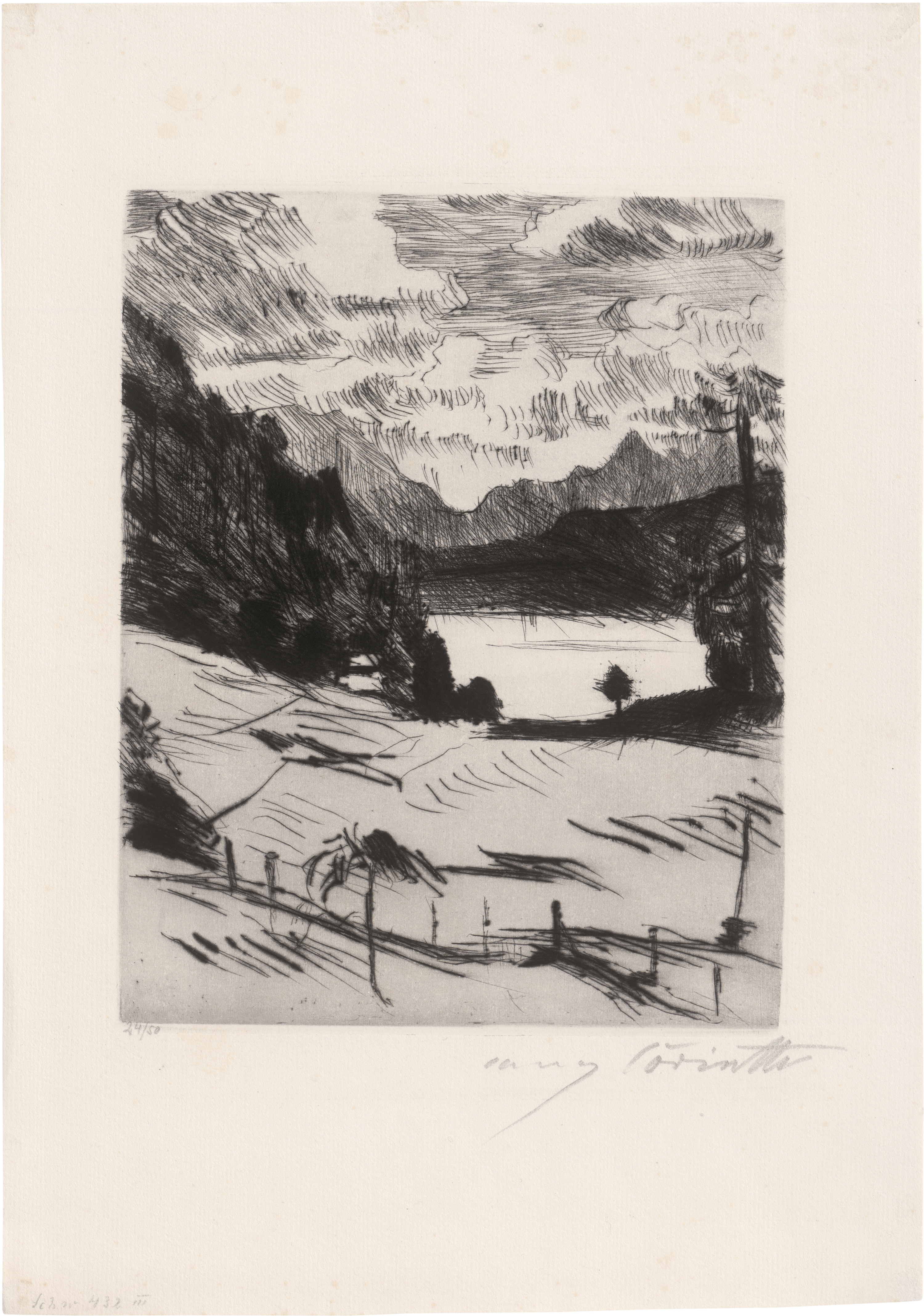 Blatt 2 der Ausgabe B der Mappe von neun Radierungen Corinths, "Am Walchensee", erschienen im Verlag Fritz Gurlitt, Berlin, in einer Gesamtauflage von 115 Exemplaren. Abweichend von den Angaben bei Schwarz betrug die Höhe der Auflage B 50 Exemplare. Prachtvoller, gratiger und tiefdunkler, in den Schwärzen samtiger Druck mit feinem Plattenton und mit Rand.