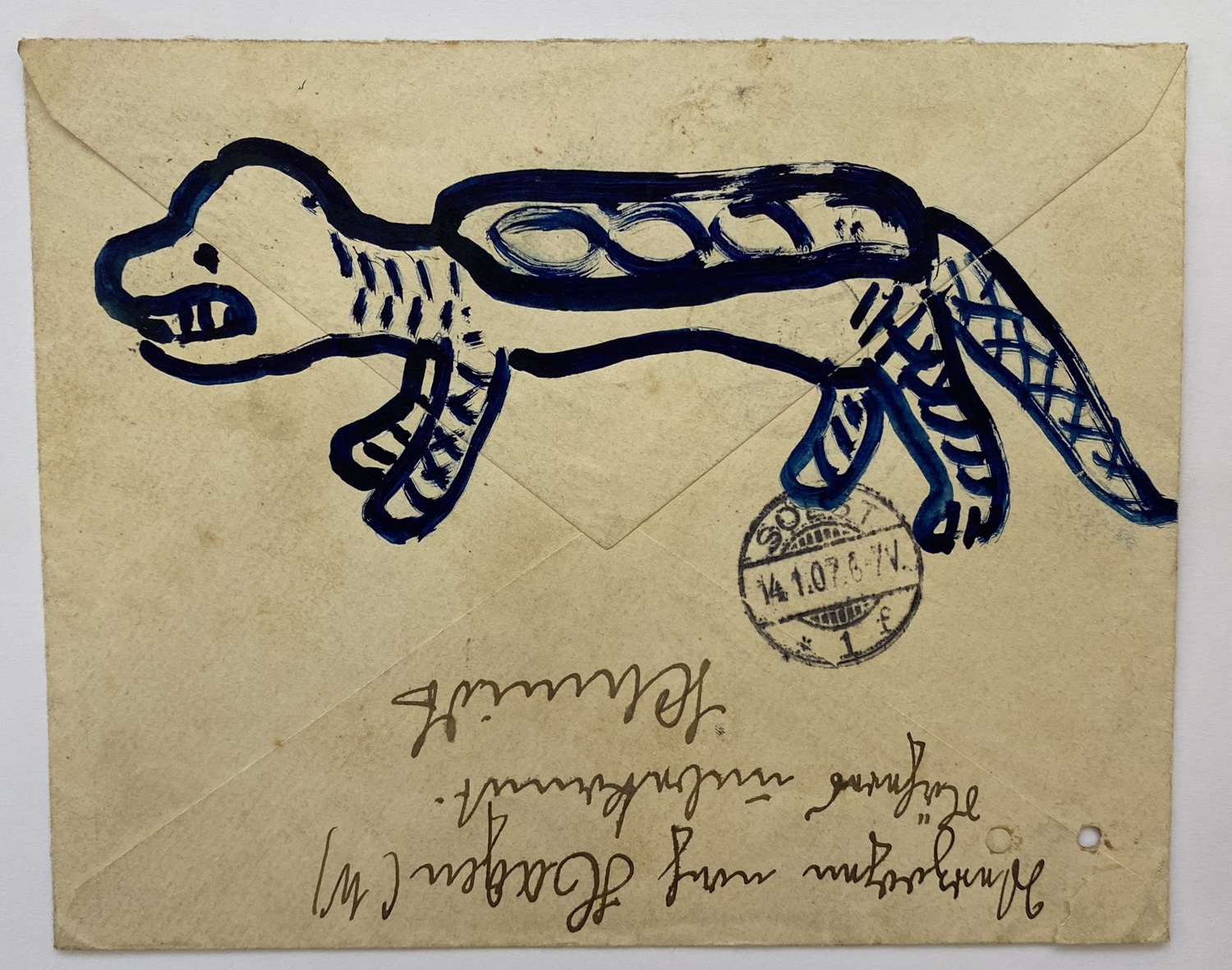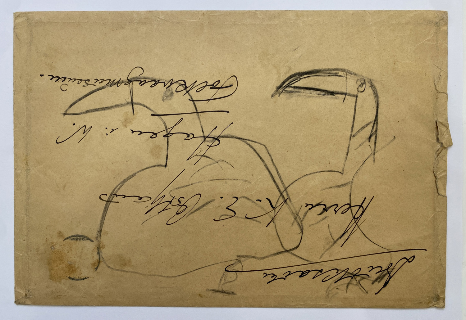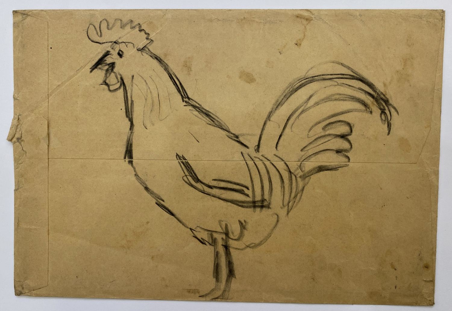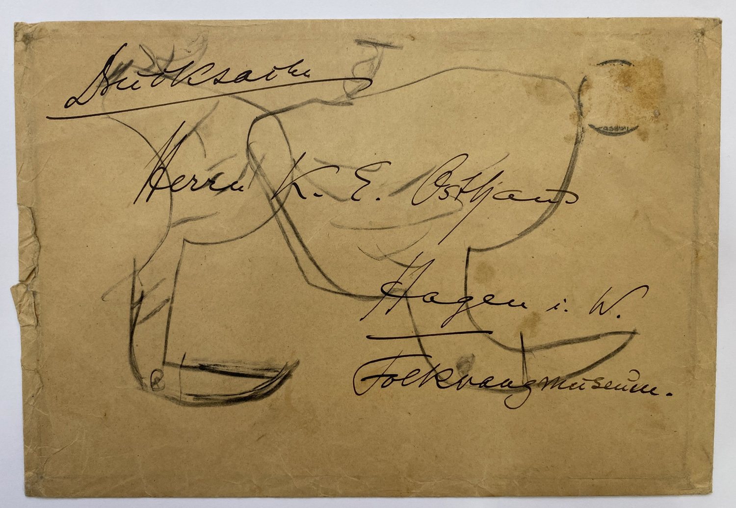 Archetypische Figuren, zeitlose und universelle Motive zeichnet Rohlfs für die fünf Kinder seines Mäzens. Auf Einladung seines Förderers Karl Ernst Osthaus lebte und arbeitete der Künstler seit 1901 in Hagen, wo er, befreit von wirtschaftlicher Not, Atelierräume im neu gegründeten Hagener Museum bezog und eine Malschule des Folkwang-Museums leitete. Fortan gehörte er fast zur Familie Osthaus; besonders zu den Kindern Eberhard, Waldemar, Manfred, Helga und Immogen hatte er ein inniges, liebevolles Verhältnis und fertigte für sie zur Freude und Unterhaltung spontan kleine Bilder an. Auf vorgefundenen unterschiedlichen Papieren, teils auf Resten, Briefumschlägen oder Werbezetteln zeichnet Rohlfs einfache, kindliche Motive: ein reitender König, Offizier und Bettler, zwei Hähne, Löwe und Krokodil, festgehalten mit kräftigen, breiten Konturen und klaren, vereinfachten Formen.