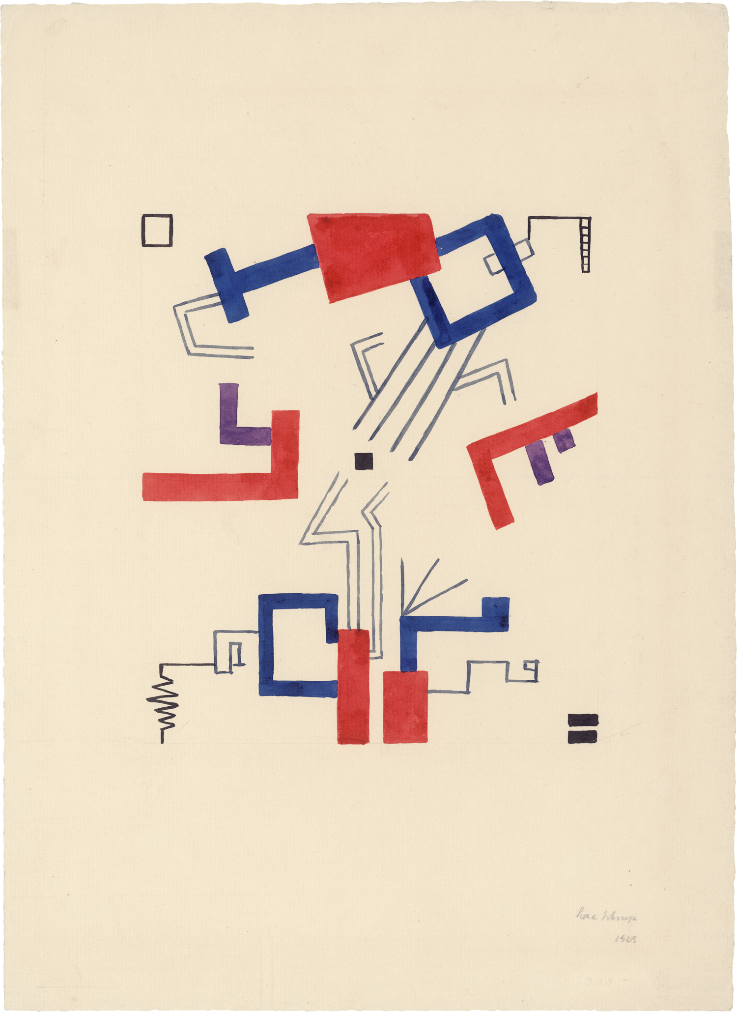 Um das kleine schwarze Quadrat im Zentrum bewegt sich die konstruktiv-geometrische, in reduziertem Farbklang von Rot, Blau und Schwarz gehaltene Komposition. Am Bauhaus führte Schreyer 1923, im Entstehungsjahr der vorliegenden Zeichnung, Regie bei dem Stück "Mondspiel", ging jedoch, nachdem die Aufführung erfolglos blieb, nach Berlin.