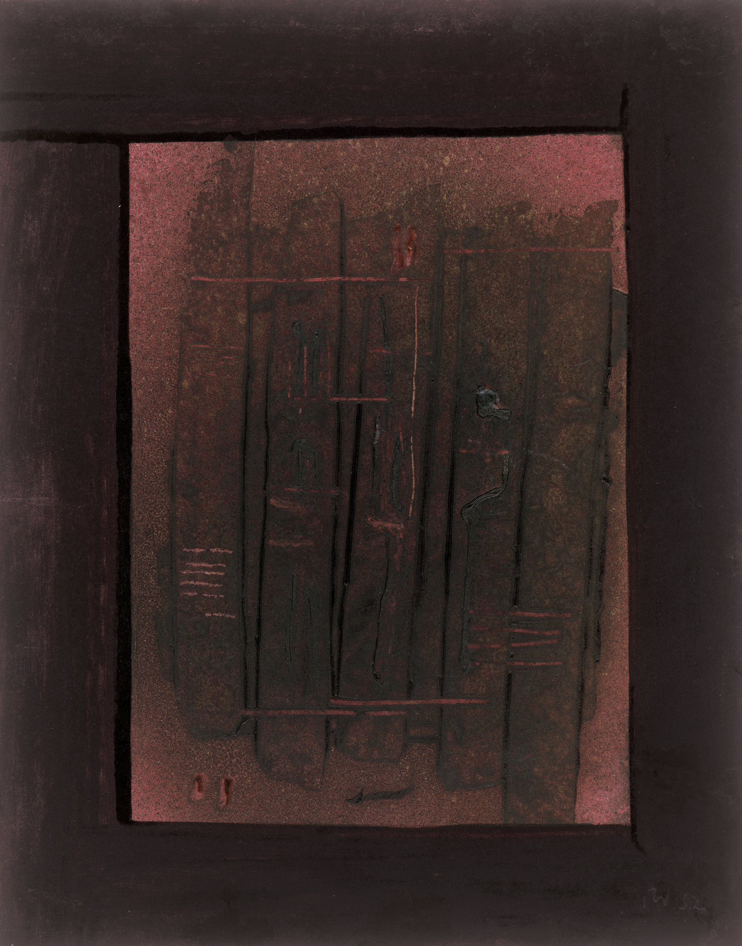 Wie durch ein Fenster schaut man durch den dunklen Rahmen tief ins Bild hinein. Das Rot liegt als diffuser, wohl mit Spritztechnik aufgebrachter hauchfeiner Schimmer in den Rändern der rechteckigen Grundform. Durchsetzt ist es mit goldenen Einsprengseln, die den Effekt verstärken. Rot blitzt auch zauberisch aus den in die dunkle Farbe gekratzten Linien hervor. Diese nuancierten, in kristalliner Geradlinigkeit gestalteten Farbelemente verleihen dem Dunkel eine komplexe Räumlichkeit und Transparenz. Die plastischen, erhaben auf der Bildfläche liegenden Farbstrukturen schweben auf dem durch den breiten schwarzen Rahmen gesicherten Untergrund und scheinen eine meditative Schwingung in dieser nächtlichen Dunkelheit zu erzeugen.