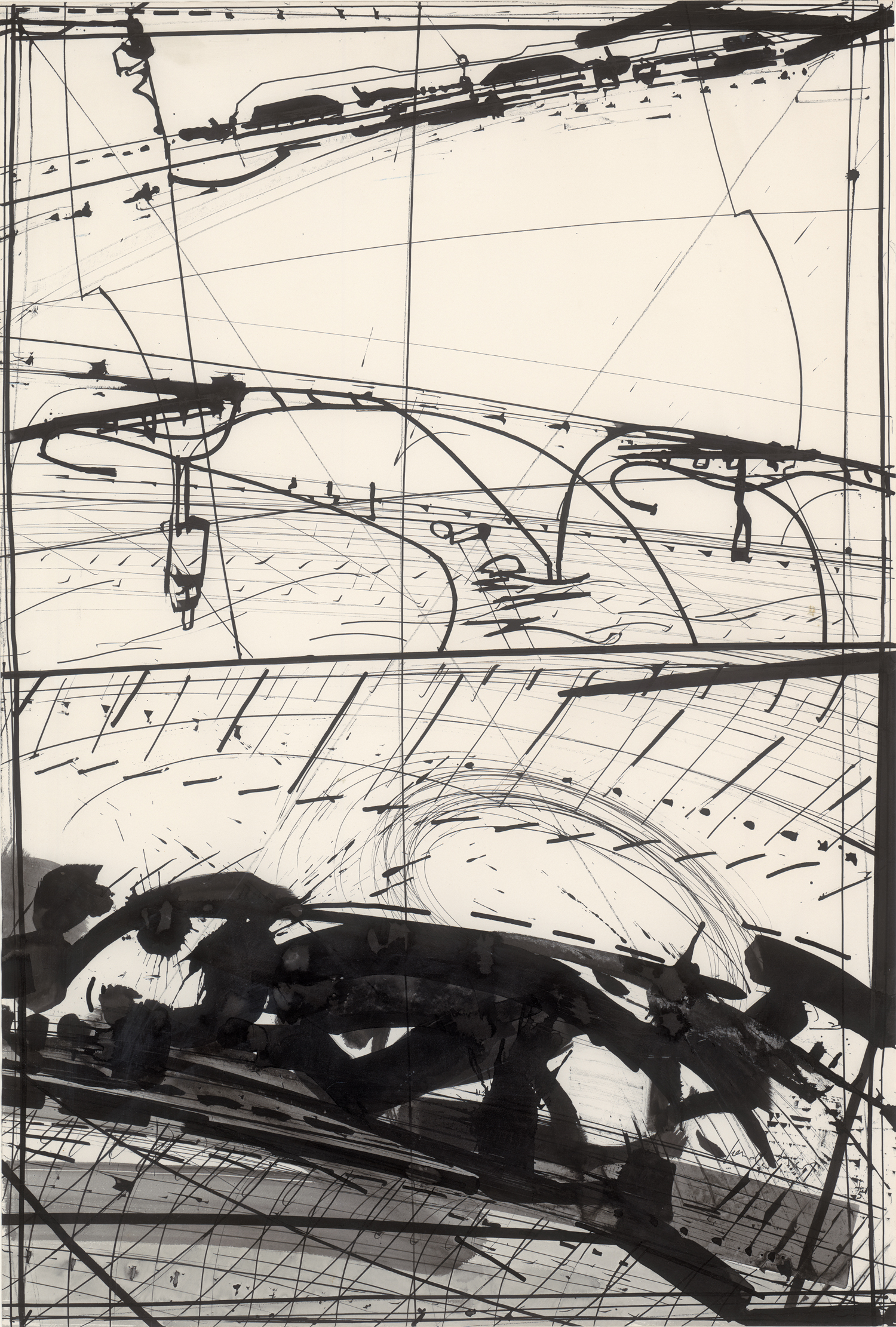Dynamische Schwünge und gerade, stahlseilartige Streben, erinnernd an die Stromabnehmer von Straßenbahnen, ziehen sich durch die ausdrucksstarke, monochrome Darstellung. "K. R. H. Sonderborgs Botschaft ist Weite und Ferne. Er liebte alles, was Räume überbrückt und Kraftlinien spürbar macht. (...) Alte Segelschiffe, altmodische Eisenkonstruktionen, aber auch die neue Technik in Form von Signalreihen sowie Netzen von Oberspannungsleitungen waren seine Themen. Das Suchen nach Spuren brachte ihn zum Legen einer Spur in einer Art labyrinthischer Traumstadt. Gegenstände verwandeln sich in Zeichen, Apparaturen werden zu abstrakten Figurinen" (staatsgalerie.de, Zugriff 25.09.2025).