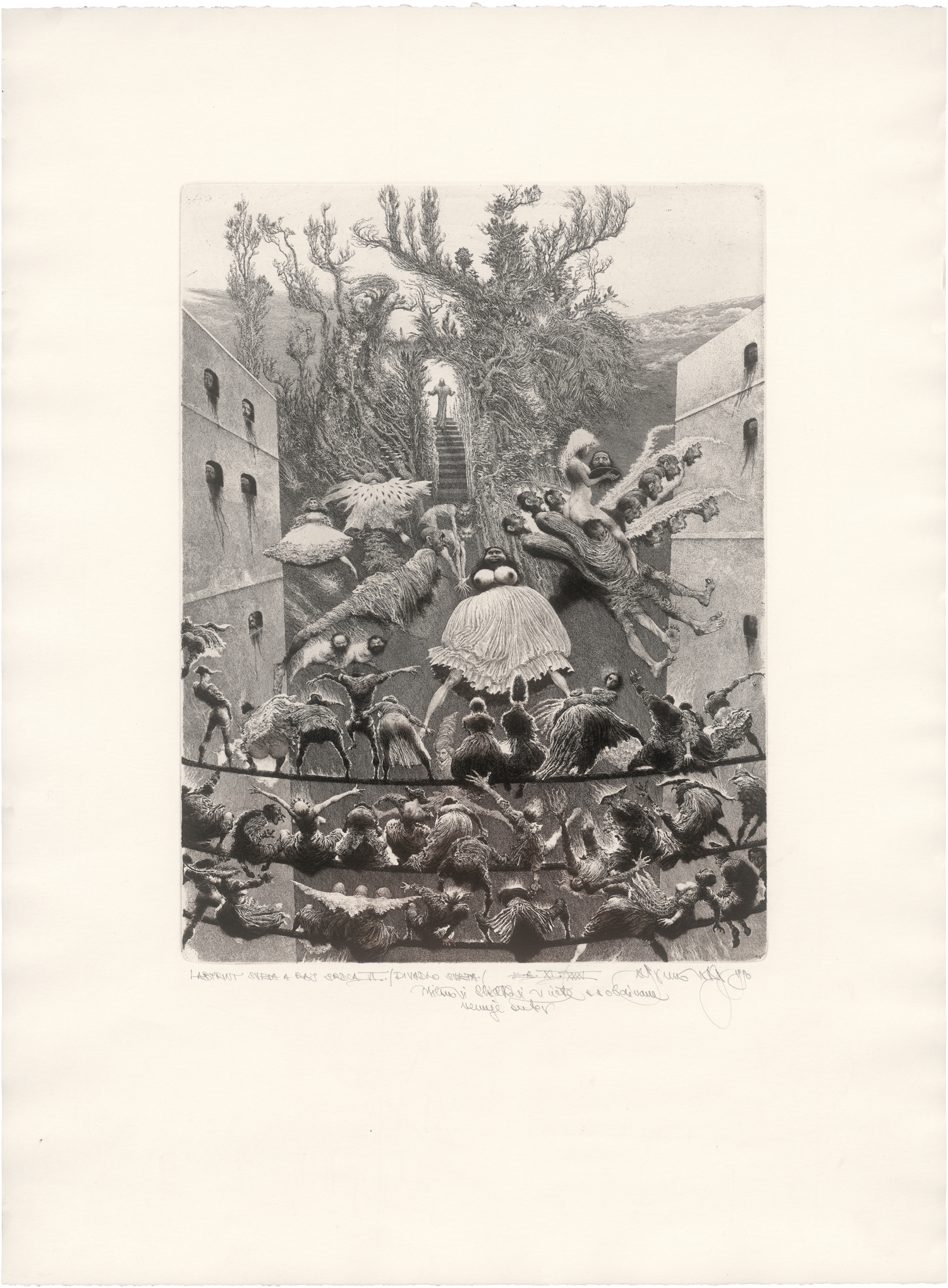 Das Labyrinth der Welt und das Paradies des Herzens VI. Tag der Welt - so der Titel des Blattes auf Deutsch. Kontrastreiche Darstellung von surrealistischer Drastik. Die Gesamtauflage betrug 100 numerierte Exemplare. Prachtvoller, schön differenzierter Druck in Schwarz und Rotbraun mit dem wohl vollen Rand, oben mit dem Schöpfrand.