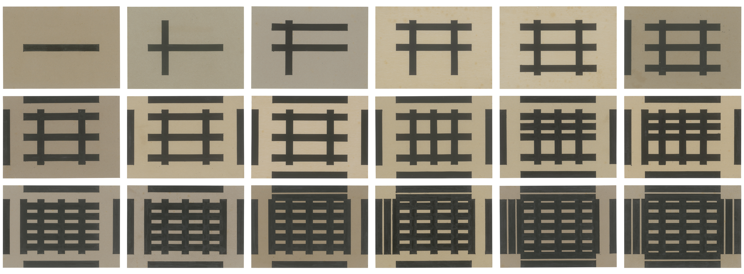 Die aus 18 Einzelblättern bestehende "Black Series III" umfasst eine Folge streng linear angeordneter gleichgroßer Zeichnungen, welche sich, von einem einzelnen horizontalen Balken ausgehend, in kontinuierlicher Zugabe weiterer Balken zu einer immer dichter werdenden Gitterstruktur entwickeln. Einem strengen Additionsprinzip folgend, sind die Blätter identisch mit ihrer eigenen Zählung und beziffern gleichsam ihre Position innerhalb der Reihung. Der Schweizer Maler Helmut Federle thematisiert in mehrfacher Hinsicht das Verhältnis zwischen Bild und Zahl. „Federles Darstellungsweise (kommt) den Stäbchenziffern der chinesischen Zahlenschrift am nächsten, die auf der strikten Alphabetisierung senkrechter und waagrechter Striche beruht. Im Jahr 1985 bereist Federle China, von dessen Kultur er sich besonders angezogen fühlt. Berührungen mit der chinesischen Kunst schlagen sich sowohl in einer Reihe neuer Schwarzweiß-Bilder als auch in der Auseinandersetzung mit fernöstlicher Kalligraphie nieder.“ (Helmut Federle, Ausst.-Kat. Kunsthaus Bregenz, Bregenz 1999, S.113) Im gesamten Oeuvre von Helmut Federle nehmen das Zeichnerische und Arbeiten auf Papier einen hohen Stellenwert ein. Seine Zeichnungen zeugen von der kontinuierlichen Auseinandersetzung mit geometrischen Formen und ihren Balanceverhältnissen auf der Bildfläche. Seine Werke sind in zahlreichen Museumssammlungen vertreten, darunter die Tate Modern, London, und das Centre Pompidou, Paris. 1997 vertrat er die Schweiz auf der Biennale in Venedig.