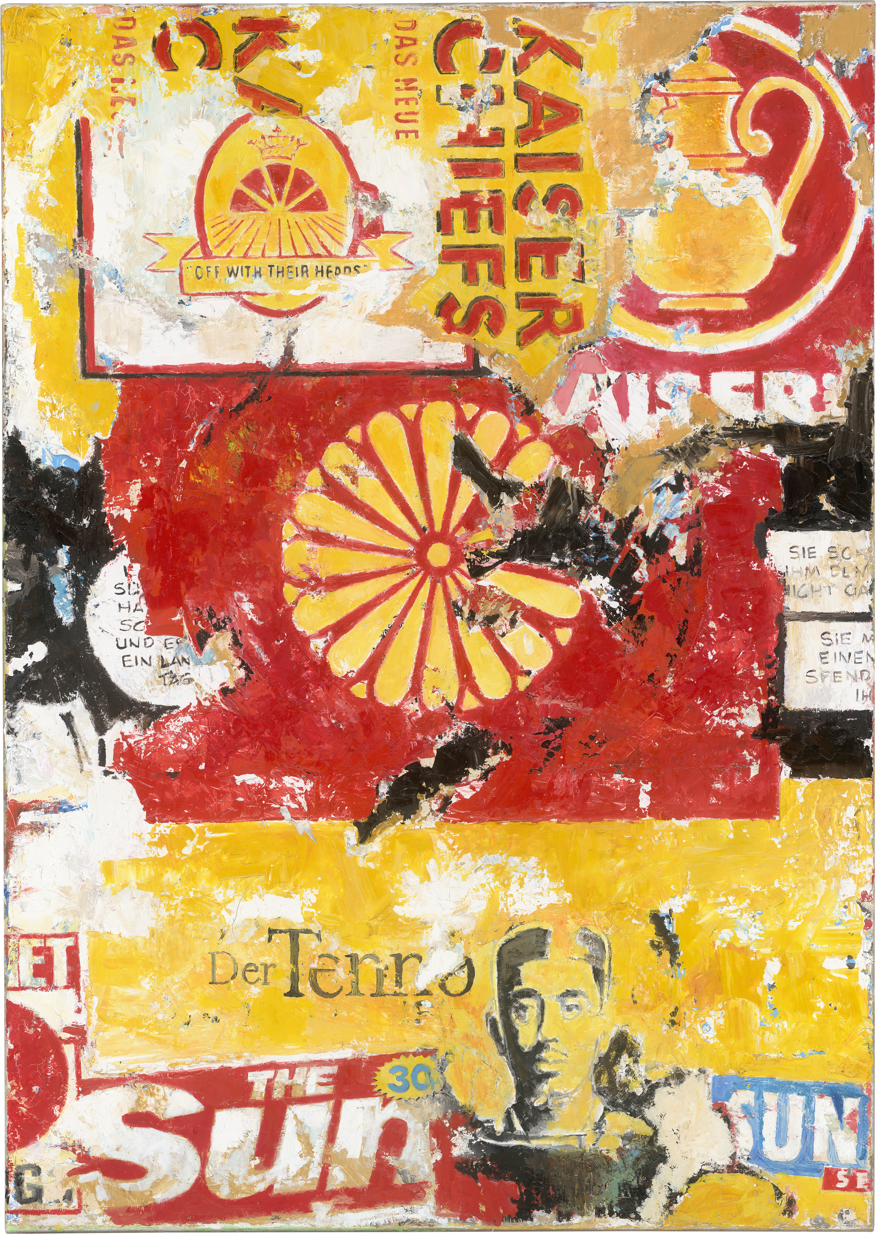 Frühe Arbeit Lorenzens aus seiner "Mauer"-Serie. Leuchtendes Rot und Gelb mit schwarzen Kontrasten, zentral darin die stilisierte Chrysanthemenblüte Jirogiku, das Nationalsymbol Japans, das auch mit dem Kaiserhaus und dem Tenno in Verbindung gebracht wird. Darum gruppiert Lorenzen ein Portrait des Kaisers ebenso wie Versatzstücke aus Reklame und Alltag. Im Mittelpunkt des Schaffens von Jens Lorenzen steht "The Wall", eine potentiell endlos angelegte Erzählung aus Bildern. Im Jahr 2008 fand seine erste Ausstellung zum Thema "Die Mauer" in der Axel-Springer-Passage, Berlin, statt; inzwischen entstanden vier "Mauer"-Serien in unterschiedlichen Bildformaten. Oft sind es alte Plakate, Reklame- oder Werbetafeln, die Lorenzen inspirieren. Die frühe Serie "Mauer II", in der sich japanische Kampfkunst-Motive in variierenden assoziativen Verknüpfungen finden, begann der Künstler nach seinem Besuch einer Samurai-Ausstellung im Schloss Gottorf, Schleswig. Die Arbeit ist abgebildet in Lorenzens Online-Verzeichnis mauer-art.com, Zugriff 11.09.2025.