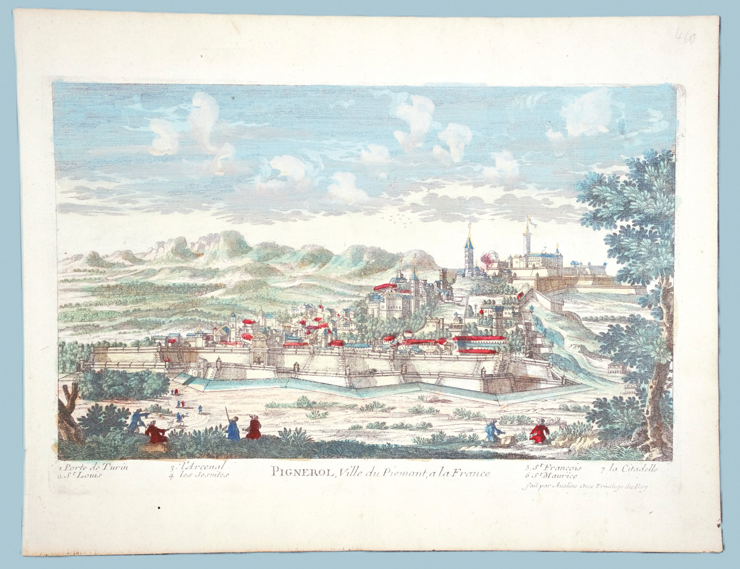 Aveline, Pierre Alexander. Pignerol, Ville du Piemont, à la France. Kolorierter Kupferstich. 21 x 31,5 cm (Plattenrand) bzw. 27 x 35 cm (Blatt). Paris 1700.