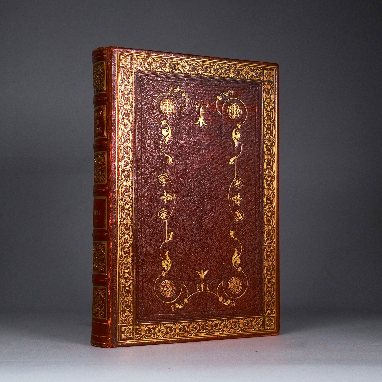 Batty, Robert. Scenery of the Rhine, Belgium and Holland. 6 Bl. Mit Stahlstichtitel mit Vignette, gestochener Schlussvignette als Tafel und 60 Stahlstichansichten auf gewalztem China, jeweils mit Erläuterungsblatt. 25,5 x 17,5 cm. Rotes Maroquin d. Z. (kaum berieben) mit goldgeprägtem RTitel, reicher ornamentaler RVergolung, mehrfachen blind- und goldgeprägten Deckelfileten mit breiter floraler Bordüre und Eckfleurons, Romantikermotiven im Spiegel, Stehkantenfileten und Innenkantenbordüre sowie Goldschnitt, Schnitt mit farbigem Fore-edge-Painting. Moderner Leinenschuber. London, Robert Jennings, 1826.