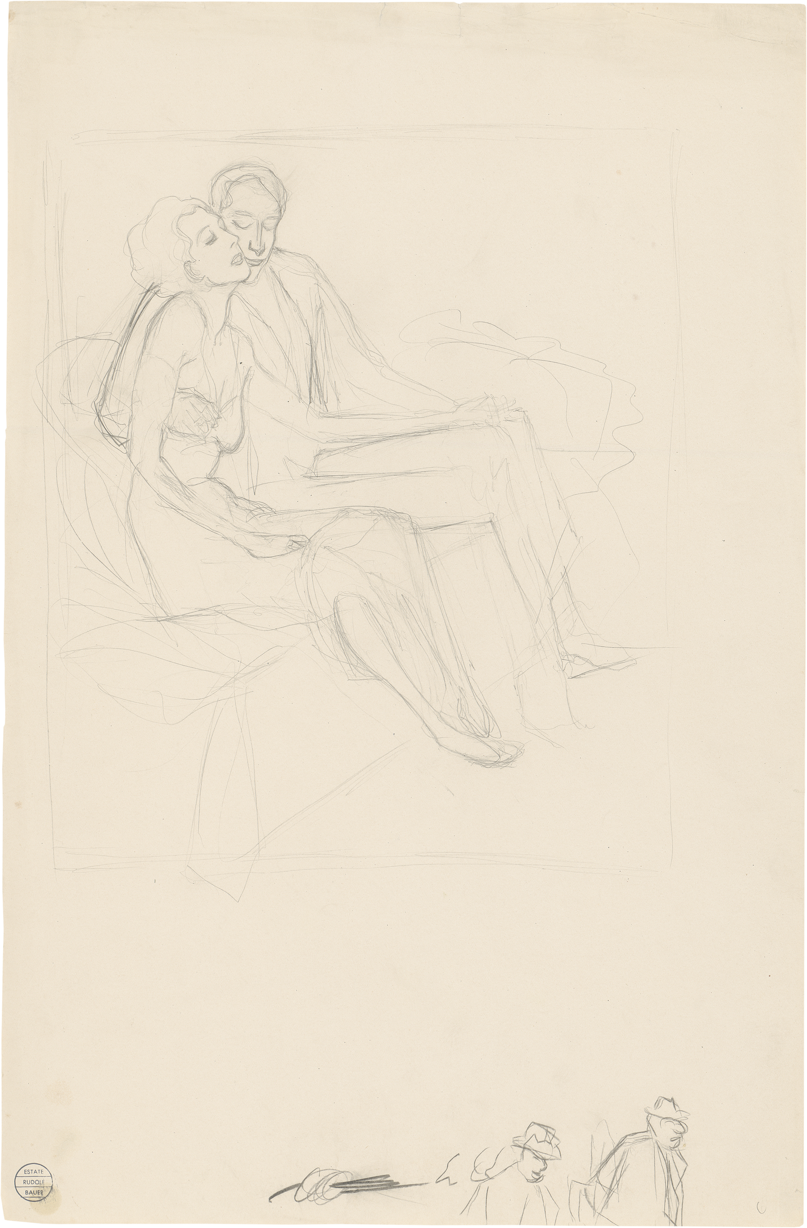 In inniger, erotischer Umarmung zeichnet Bauer Mann und Frau nebeneinander sitzend, die Figuren unter Verzicht auf Binnenstrukturen in sicheren Konturen umrissen und im Unterrand mit flüchtigen Remarquen ergänzt.
