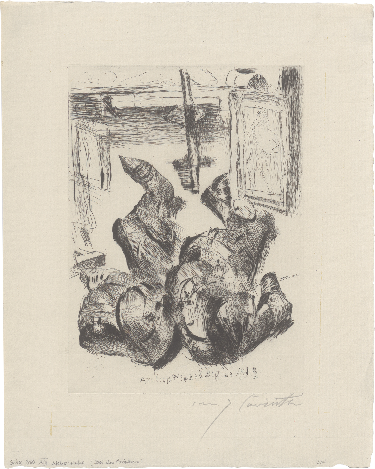 Blatt 13 der 14 Radierungen umfassenden Folge "Bei den Corinthern", erschienen im Verlag E.A. Seemann, Leipzig 1919, in einer Gesamtauflage von 100 Exemplaren. Ganz ausgezeichneter Druck mit zartem Plattenton und dem vollen Rand, an drei Seiten mit dem Schöpfrand. Beigegeben: Eine Kaltnadel von Corinth, "Stehendes Mädchen, 1896 (Schwarz 19 II).