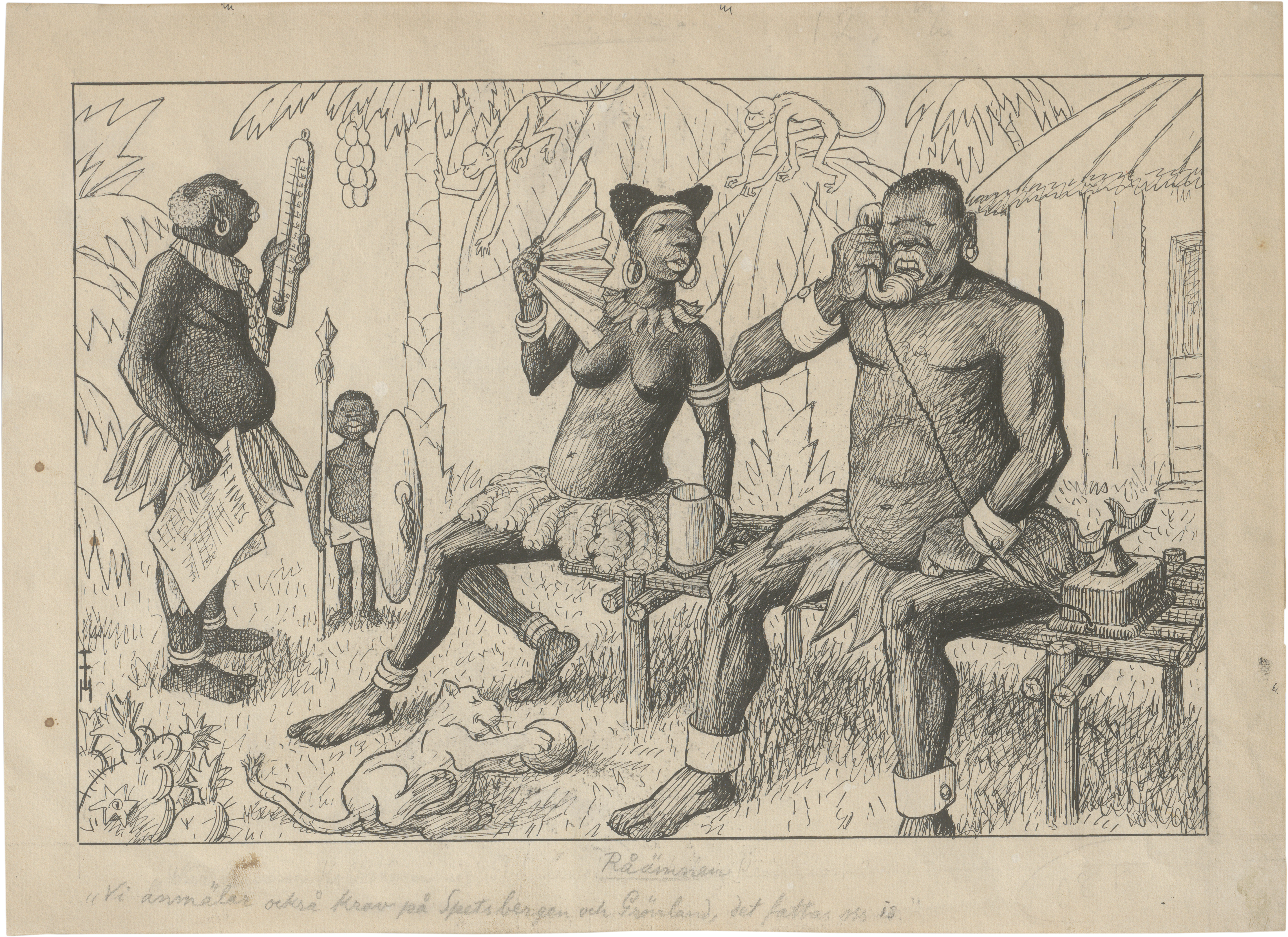Mit der Bleistiftbezeichnung: "Wir melden auch Ansprüche auf Spitzbergen und Grönland, uns fehlt Eis." Wohl eine Vorzeichnung für eine Illustration, die unter dem Titel "Rohstoffe" eine weitere satirische Abhandlung mit den für Heine typischen politischen Themen darstellt.