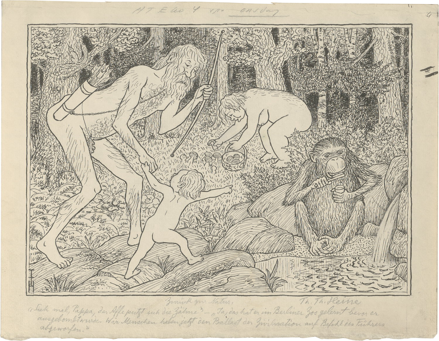 Mit der Bleistiftbezeichnung: "Sieh mal, Pappa, der Affe putzt sich die Zähne" - "Ja, das hat er im Berliner Zoo gelernt bevor er ausgebombt wurde. Wir Menschen haben jetzt den Ballast der Zivilisation auf Befehl des Führers abgeworfen." Mit der vorliegenden Zeichnung kritisiert und karikiert Heine die nationalsozialistische Diktatur des "Dritten Reichs" im schwedischen Exil.