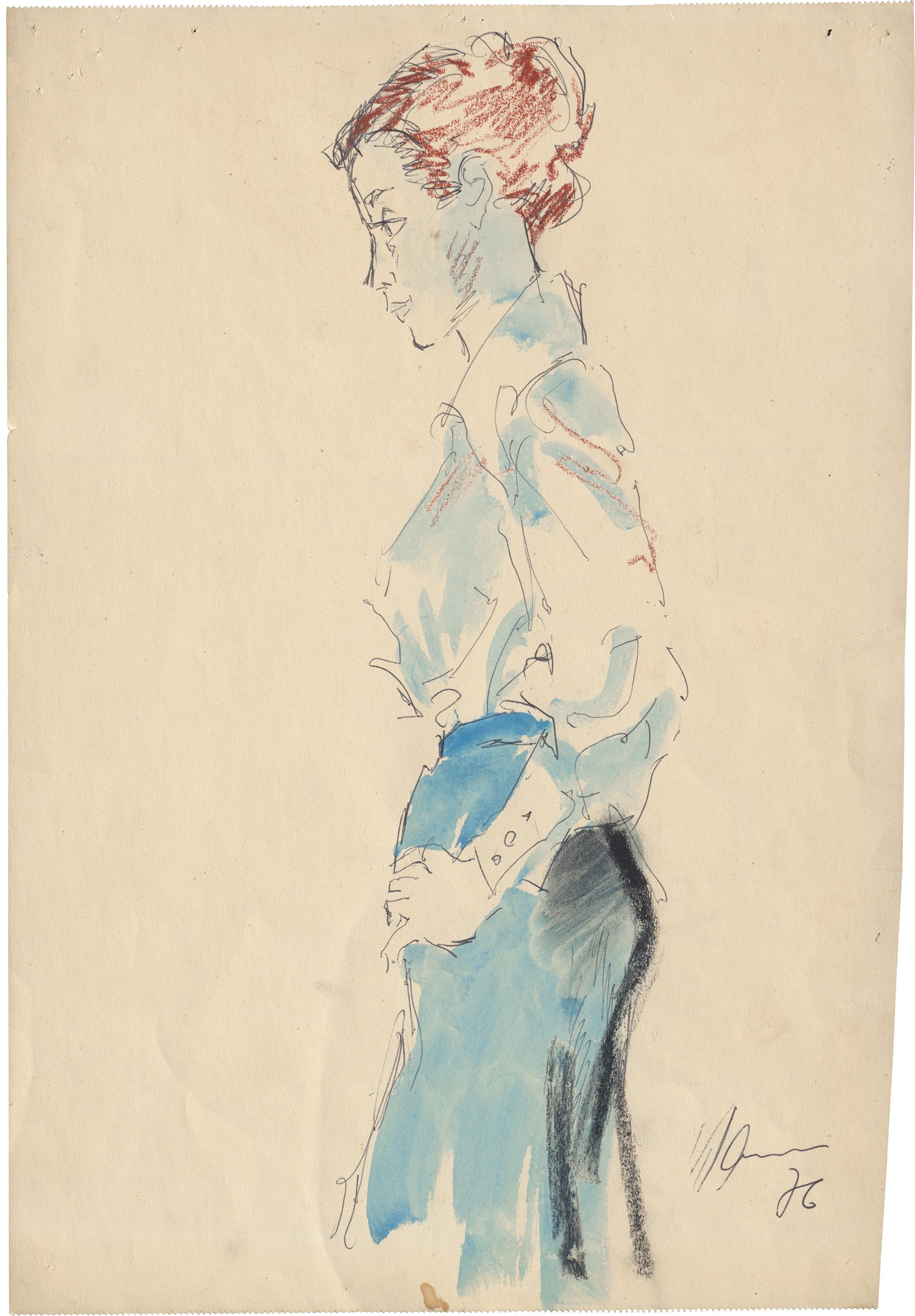 Selbstbewusstsein und Modernität strahlt die stehende junge Frau mit dem Kurzhaarschnitt aus, deren aufrechte Gestalt Klamann mit wenigen sicheren Konturen und Farbakzenten erfasst.