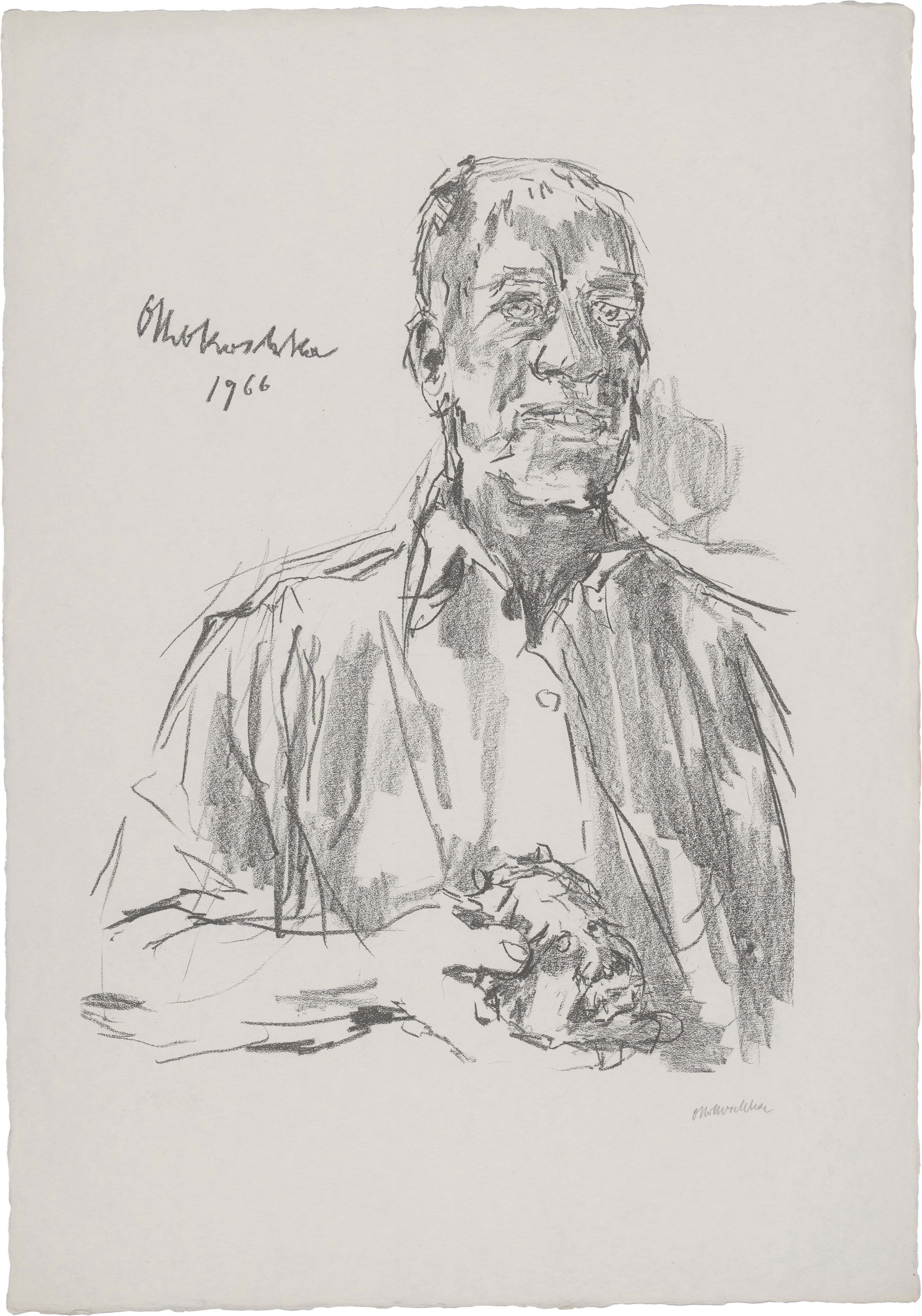 Großformatige Lithographie, erschienen in einer Auflage von 70 numerierten Exemplaren bei Marlborough Fine Art, London; das Vorliegende wohl ein Künstlerexemplar außerhalb der Auflage. Zu seinem 80. Geburtstag 1966 zeichnete Kokoschka drei Selbstbildnisse, darunter dieses. Prachtvoller, wunderbar klarer Druck mit dem vollen, sehr breiten Schöpfrand.