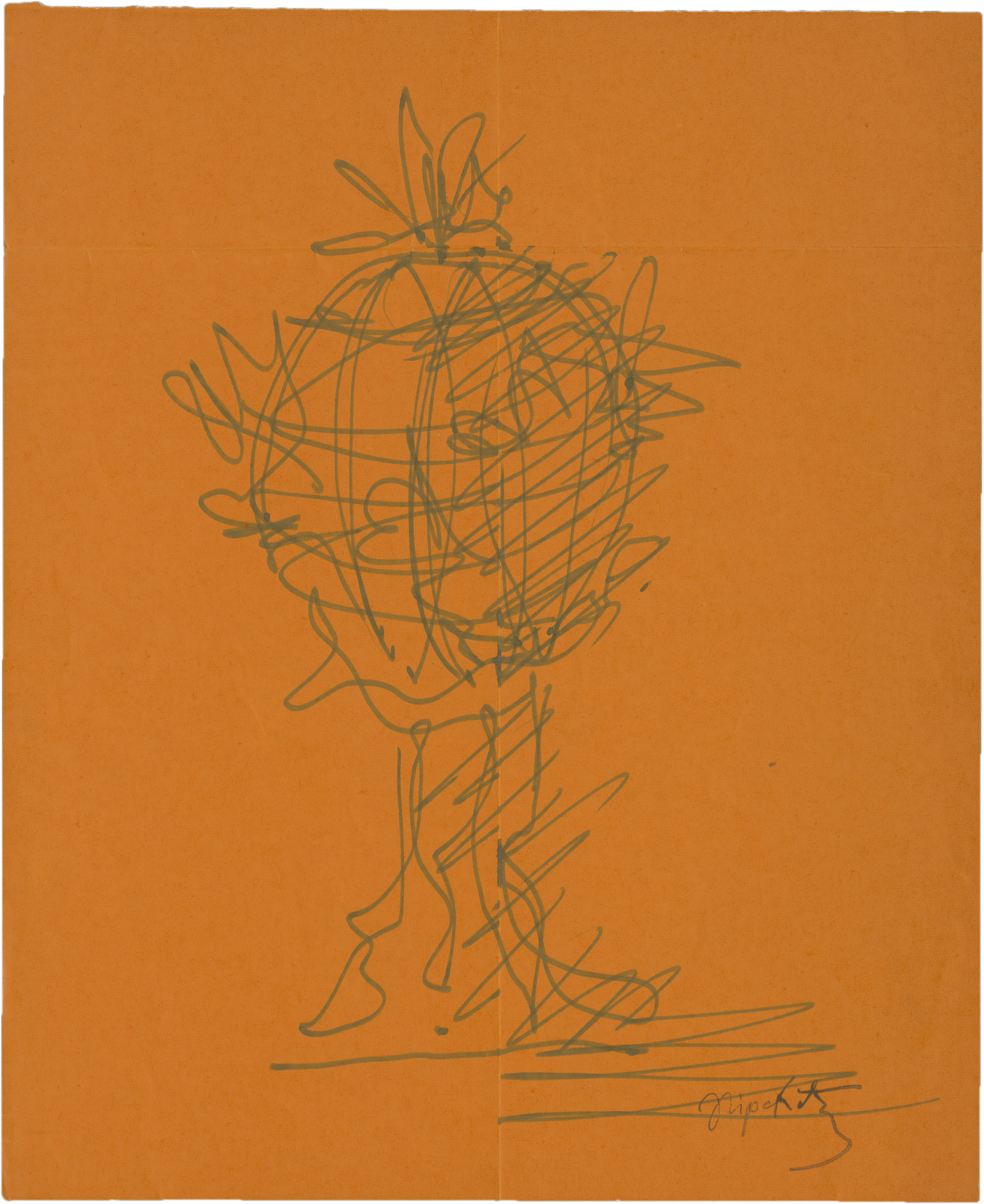 Schwungvolle Entwurfszeichnung, wohl für eine Skulptur, gezeichnet auf der Rückseite eines Programms für eine Modeschau der Philadelphia Museum School of Art.