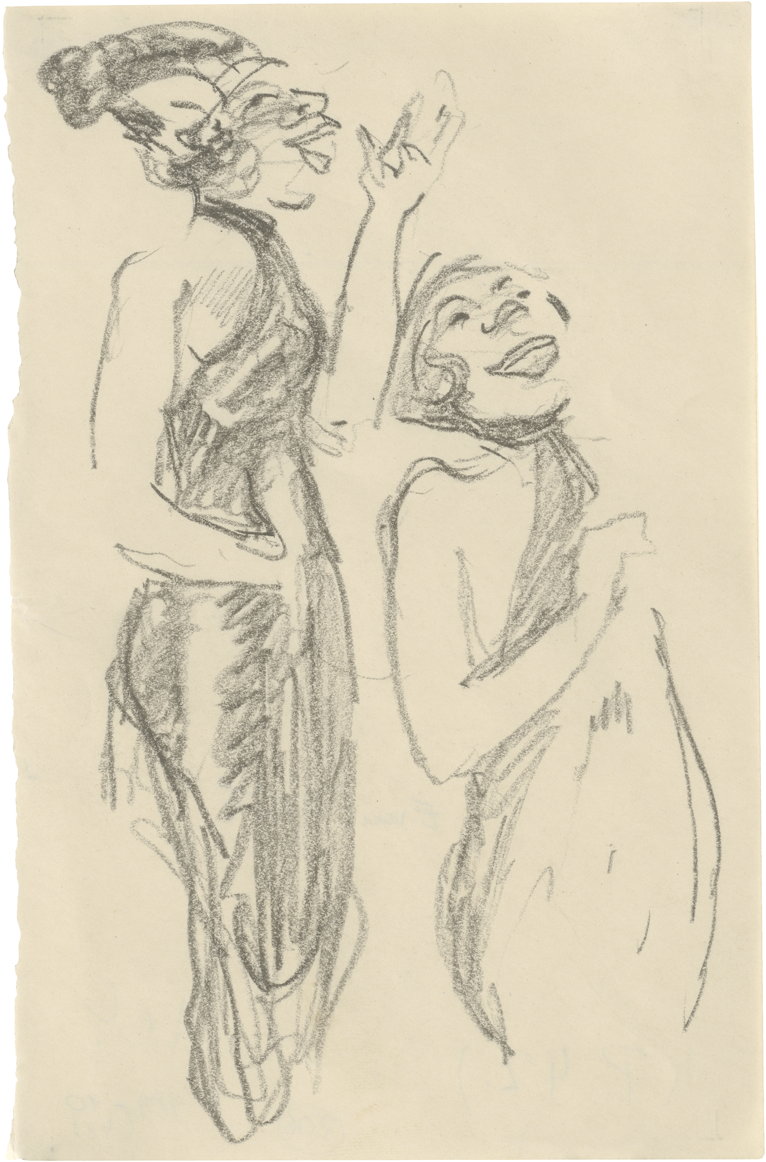 Lockere, weiche Linien der schwarzen Kreide erfassen die beieinander stehenden Gestalten der beiden unterschiedlich großen Sängerinnen und betonen in leicht karikierender Manier die ausdrucksvollen großen Münder der Frauen. Die kantigen Körper der Kamele untersucht Orlik zeichnerisch mit sicherem Strich und sparsamen Binnenschraffuren.